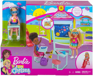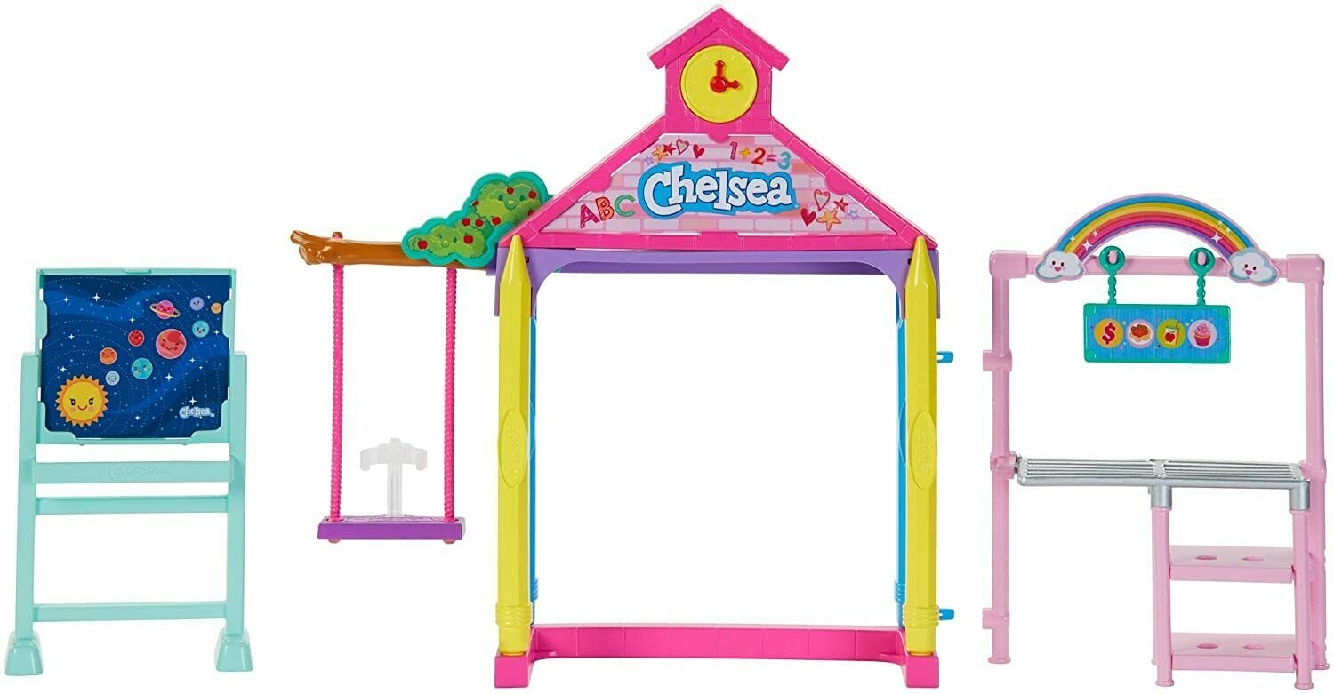 Chelsea and her friends inspire young minds to explore the world. Just like big sister Barbie, they love to try new things, challenge themselves and have fun. This Barbie Club Chelsea School playset is the perfect place for young minds to explore the classroom and beyond! Sweet schoolhouse decorations, storytelling accessories and multiple play areas inspire imaginative fun. When class is in session, seat Chelsea doll and a friend (sold separately) in the two desk and chair sets. A blackboard accessory encourages storytelling: flip it back and forth to switch between subjects. When it's time for recess, send Chelsea doll down the slide or clip her into the swing and push! Don't forget to stop by the cafeteria for a snack -a lunch counter, trays and a cash register add to the storytelling fun. Young imaginations will love exploring the school setting and playing out their own sweet stories because when a girl plays with Barbie and her sisters, she imagines everything she can become! Collect all the Chelsea dolls and toys to expand the playtime possibilities (each sold separately, subject to availability). Colors and decorations may vary.