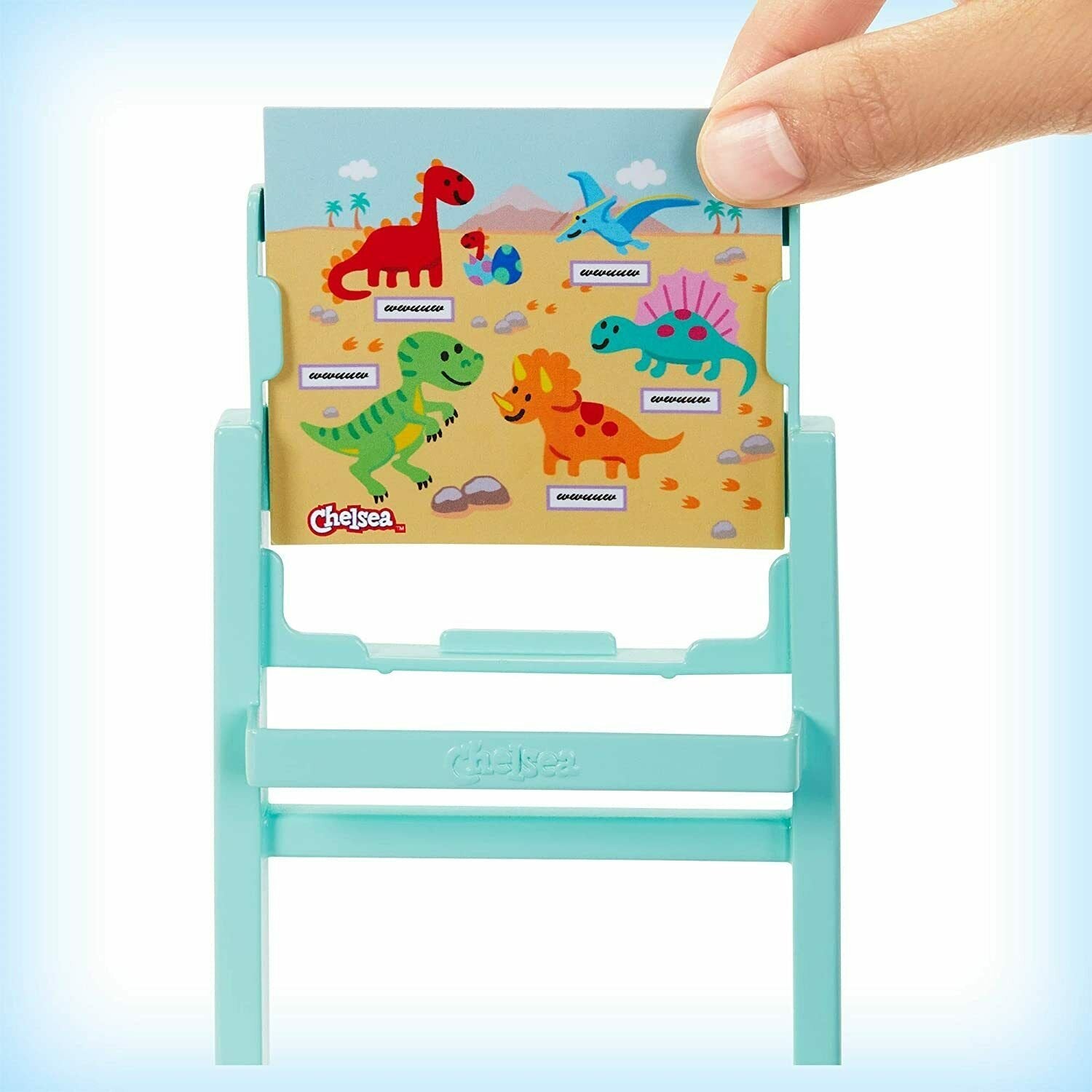 A classroom area inspires storytelling with desk and chair sets for Chelsea and a friend (sold separately) and a flipping blackboard with fun graphics.