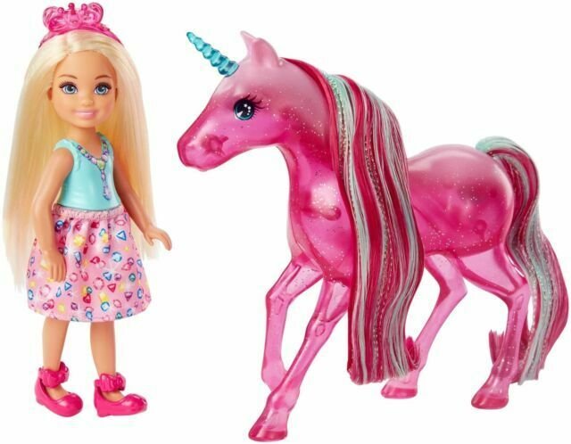 Chelsea doll and her unicorn friend make dreams come true together! When Chelsea doll enters Barbie Dreamtopia, she enters a world where unicorns can be a best friend. This pretty pink unicorn from the kingdom of Sparkle Mountain sparks imaginations with a translucent glittery body, a bright teal unicorn horn and a mane and tail with long pink and teal hair. Kids will want to hop on and let their stories take off. Chelsea doll is ready for adventure in a colorful outfit that celebrates the gem-filled kingdom: a necklace is detailed on her teal bodice, a colorful gemstone print decorates her pink skirt, her pink shoes have bows and a pink bow headband tops the sparkling look. Young imaginations can tell all kinds of tales with Chelsea doll and her unicorn friend because when you enter Dreamtopia with sisters Barbie and Chelsea, you wake up to a world where dreams become reality! Collect all of the Barbie Dreamtopia dolls and accessories and let your dreams take flight (each sold separately, subject to availability). Includes Chelsea doll wearing fashion and accessories, plus unicorn. Colors and decorations may vary. Ideal for ages 3 years and up.