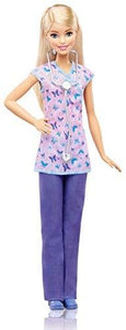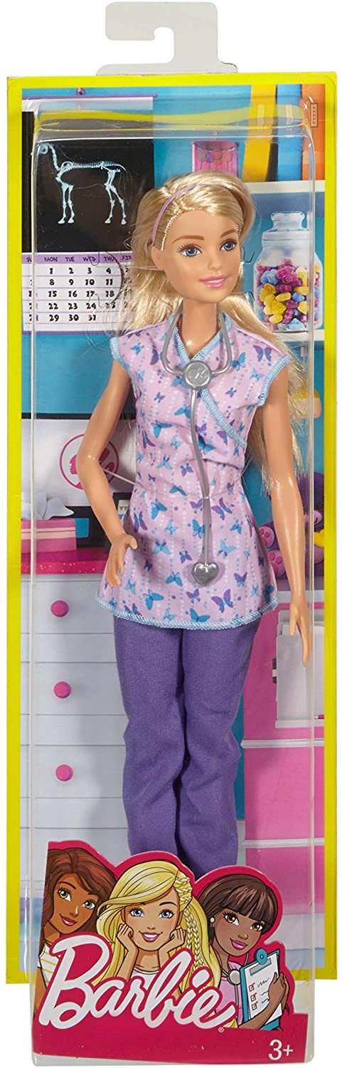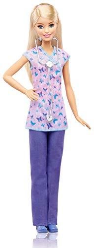 Dream big with Barbie career dolls! Barbie doll can take on any goal, and this nurse doll wants to ensure all her patients are healthy! Nurses are trained to care for patients and provide medical knowledge. Barbie nurse doll is ready to monitor her patients wearing a career-themed outfit complete with accessories that enhance storytelling. Barbie nurse doll is ready to care for patients in purple scrubs with a cute butterfly print top and purple shoes. Her long blonde hair hangs in a trendy straight style. And a silvery stethoscope helps give patients their checkups! Young minds will love exploring the world of nursing with Barbie nurse doll. Explore all of the Barbie career dolls because with Barbie, you can be anything (each sold separately, subject to availability). Includes nurse Barbie doll wearing fashions and accessories, plus stethoscope. Doll cannot stand alone. Colors and decorations may vary.
