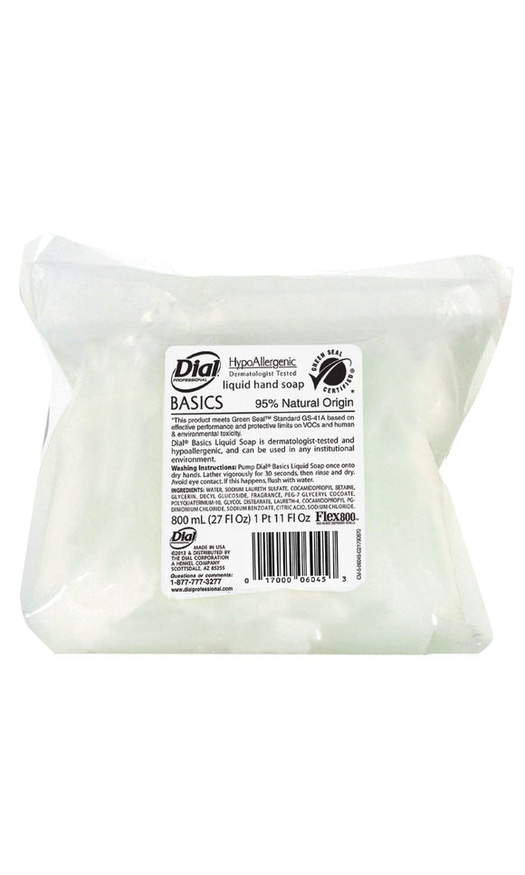 Dial Basics honeysuckle floral white pearl hypoallergenic liquid hand soap, 800 mL flex pack, helps remove unwanted dirt, residue, and bacteria from hands, and contains glycerin, isostearamidopropyl morpholine, and lactate to help keep skin hydrated. This flex pack is for use in push-button liquid soap dispensers (sold separately). The hand soap has a honeysuckle floral fragrance, a white pearl color, a pH of 6.55, a viscosity of 3,500, and a specific gravity of 1.018.