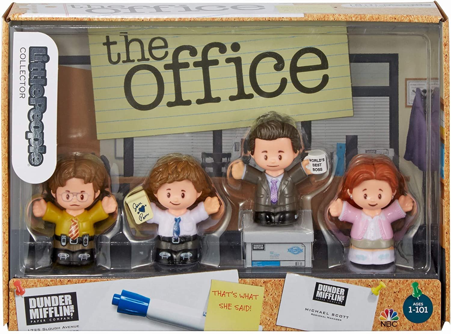 Bring the shenanigans of the Dunder-Mifflin paper company to your home with this Little People Collector The Office figure set by Fisher-Price! This set features four figures styled to look just like characters from the hit American TV series The Office, including Michael Scott, Dwight Schrute, Pam Beesly and Jim Halpert. This must-have figure set is a great gift for The Office fans of all ages.
