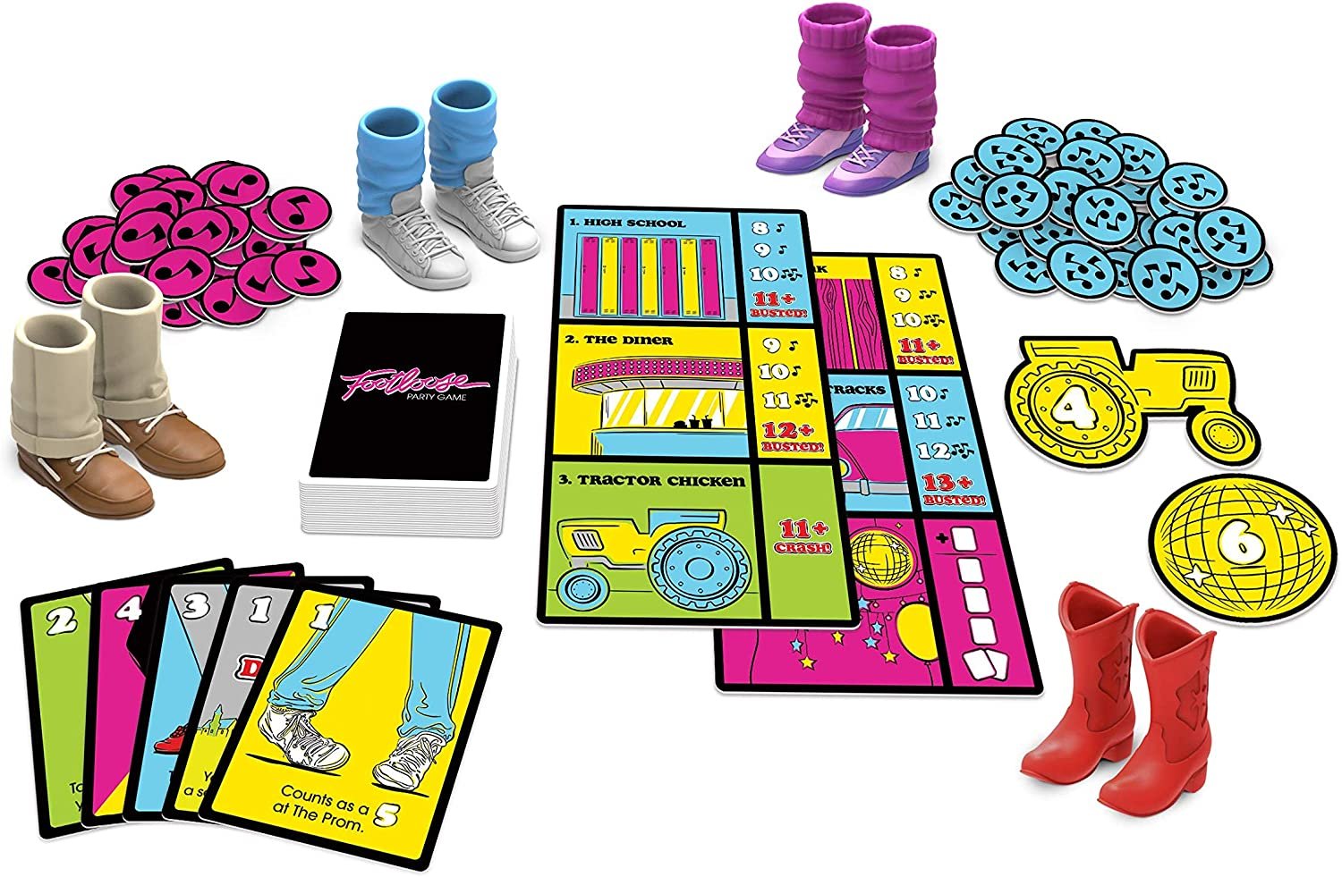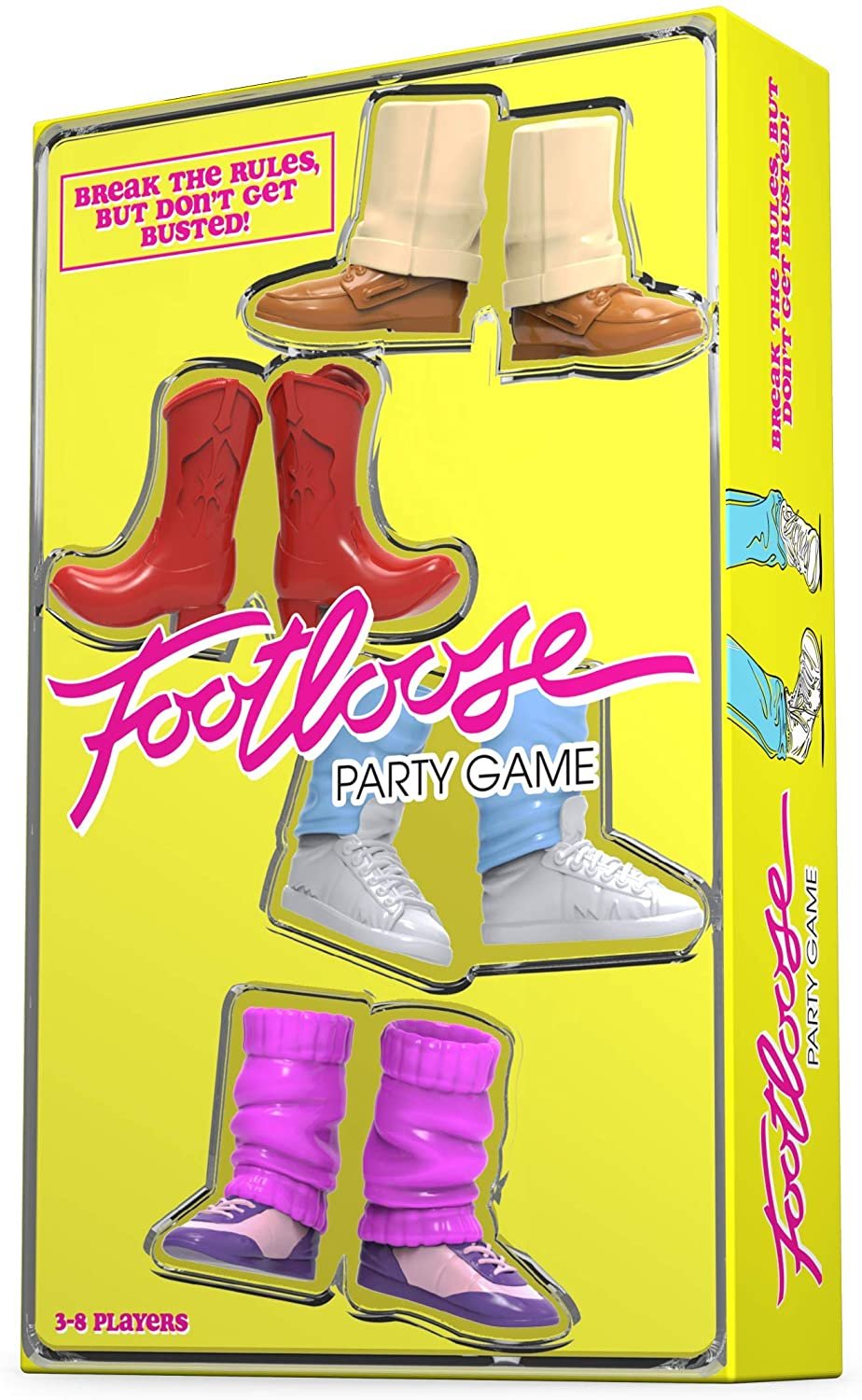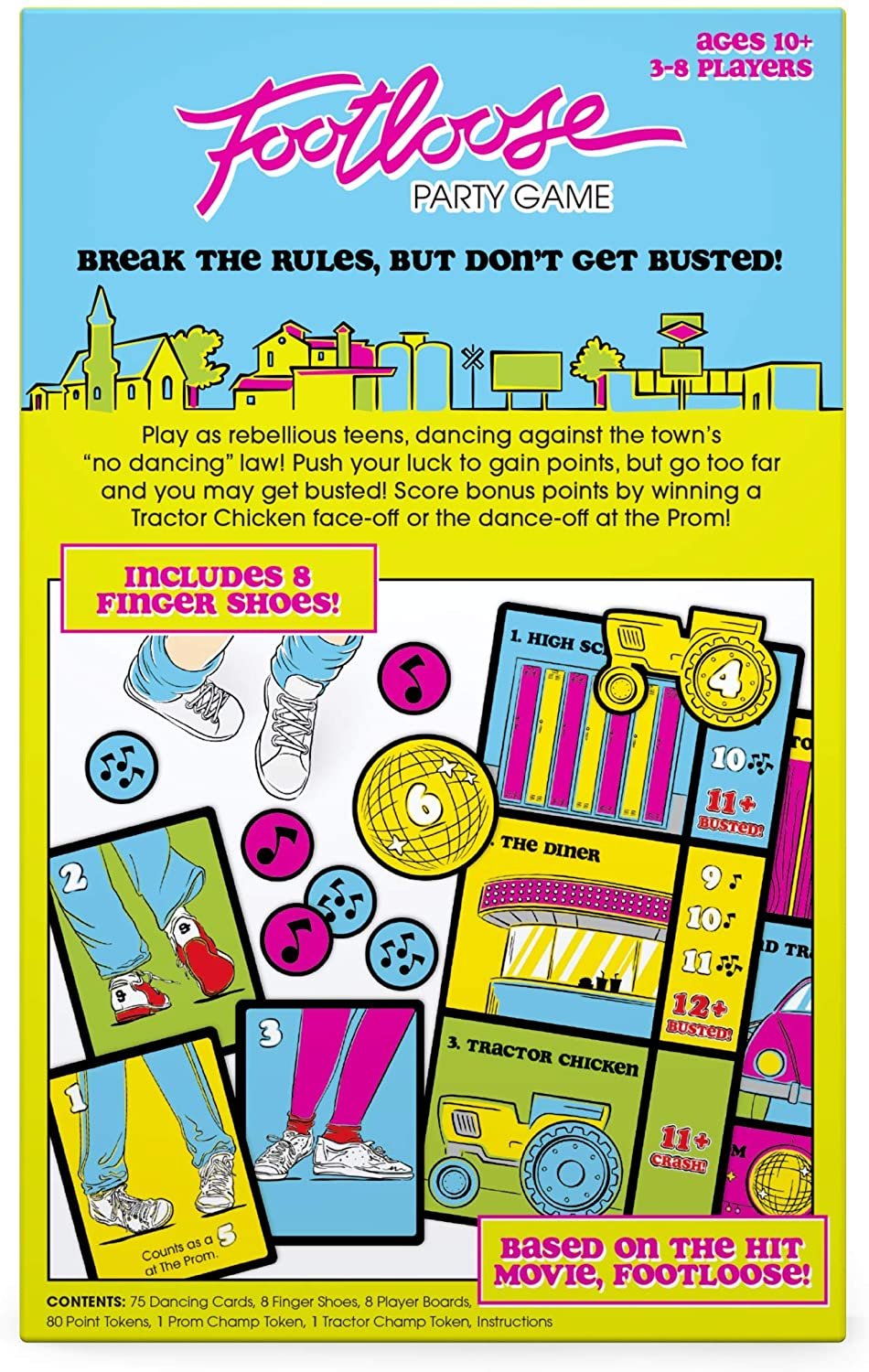 Play as rebellious teens dancing against the small town's "no dancing" law! Cut loose around Bomont, from the drive-in diner and the old mill to the honky tonk, pushing your luck to gain points. Score bonuses by winning a tractor-chicken face-off or the dance-off at the Prom. To win, break the rules, but don't get busted! With its colorful retro look and fun and flexible "finger shoes," this family-friendly party game celebrates the 1980s hit movie in style!