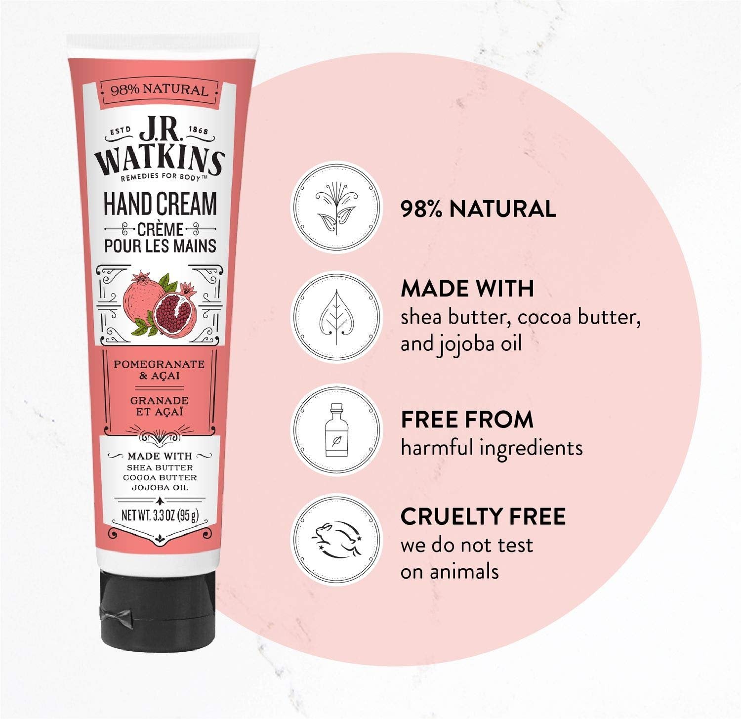 J.R. Watkins Natural Moisturizing Hand Cream, Hydrating Hand Moisturizer with Shea Butter, Cocoa Butter, and Avocado Oil, USA Made and Cruelty Free, 3.3oz, Pomegranate & Acai, Single