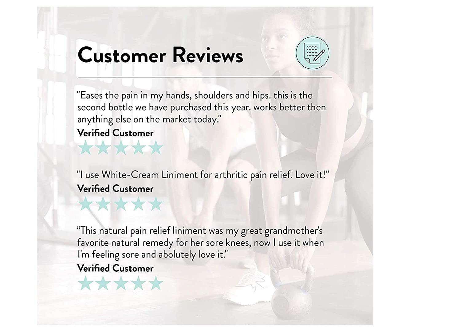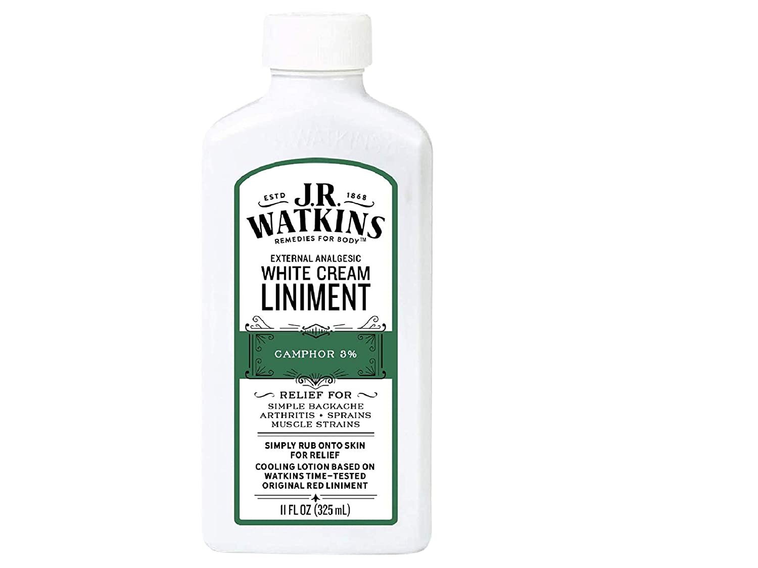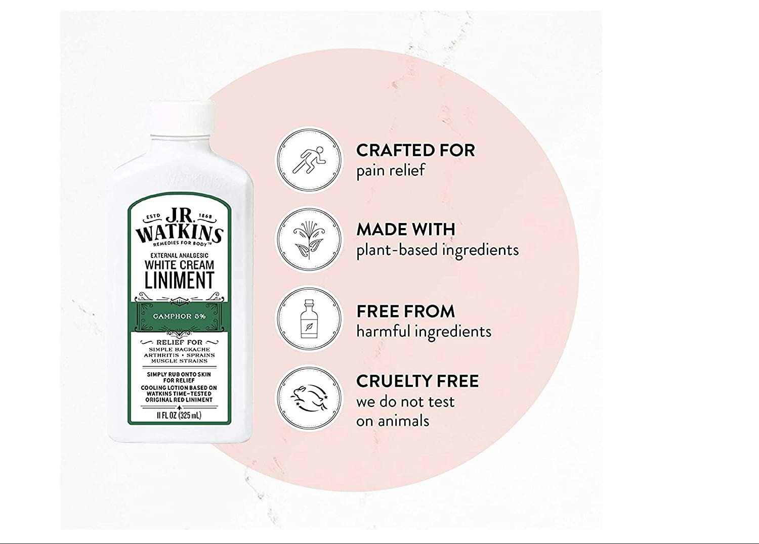 This effective pain relief formula uses evergreen-based counterirritants to provide temporary relief from arthritis, muscle strains, and discomfort resulting from over exertion. The creamy lotion wont dry skin. Rub it in to stimulate circulation and leave your skin feeling soft and smooth. White Cream Liniment comes in our shatter-resistant Trial Mark bottle. Highlights: White Cream Liniment comes in 11 Oz/325 ml bottle Cooling Camphor lotion Won't dry skin, leaves it feeling soft and smooth Active Ingredients: Camphor 3.0 % w/w Turpentine oil 9% w/w Inactive Ingredients: Ammonium chloride, ammonium hydroxide, mineral oil, stearic acid, sodium tallowate, triethanolamine, water