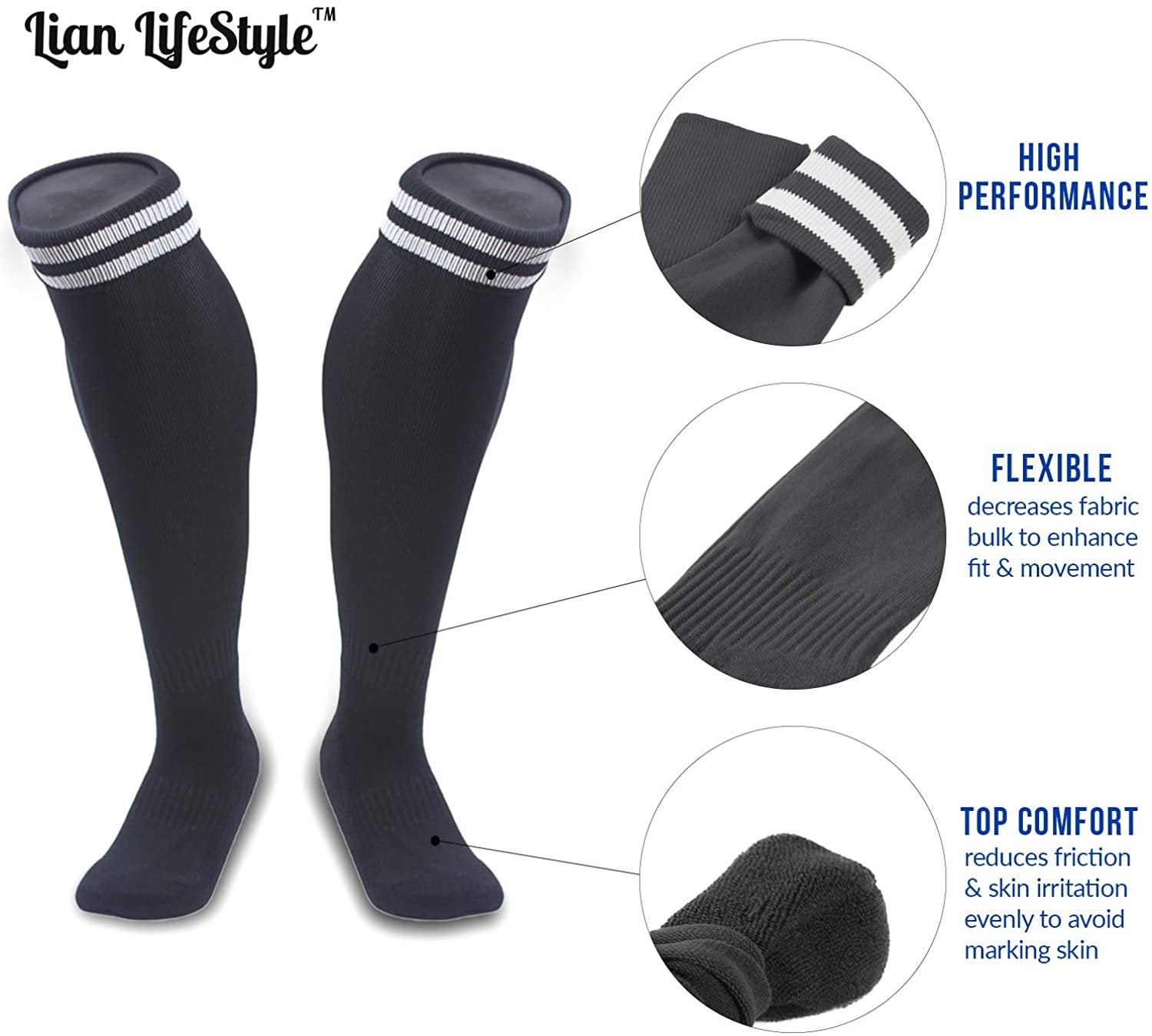 Lian LifeStyle Big Boy's 1 Pair Knee High Sports Socks for Baseball/Soccer/Lacrosse XL002 M Black