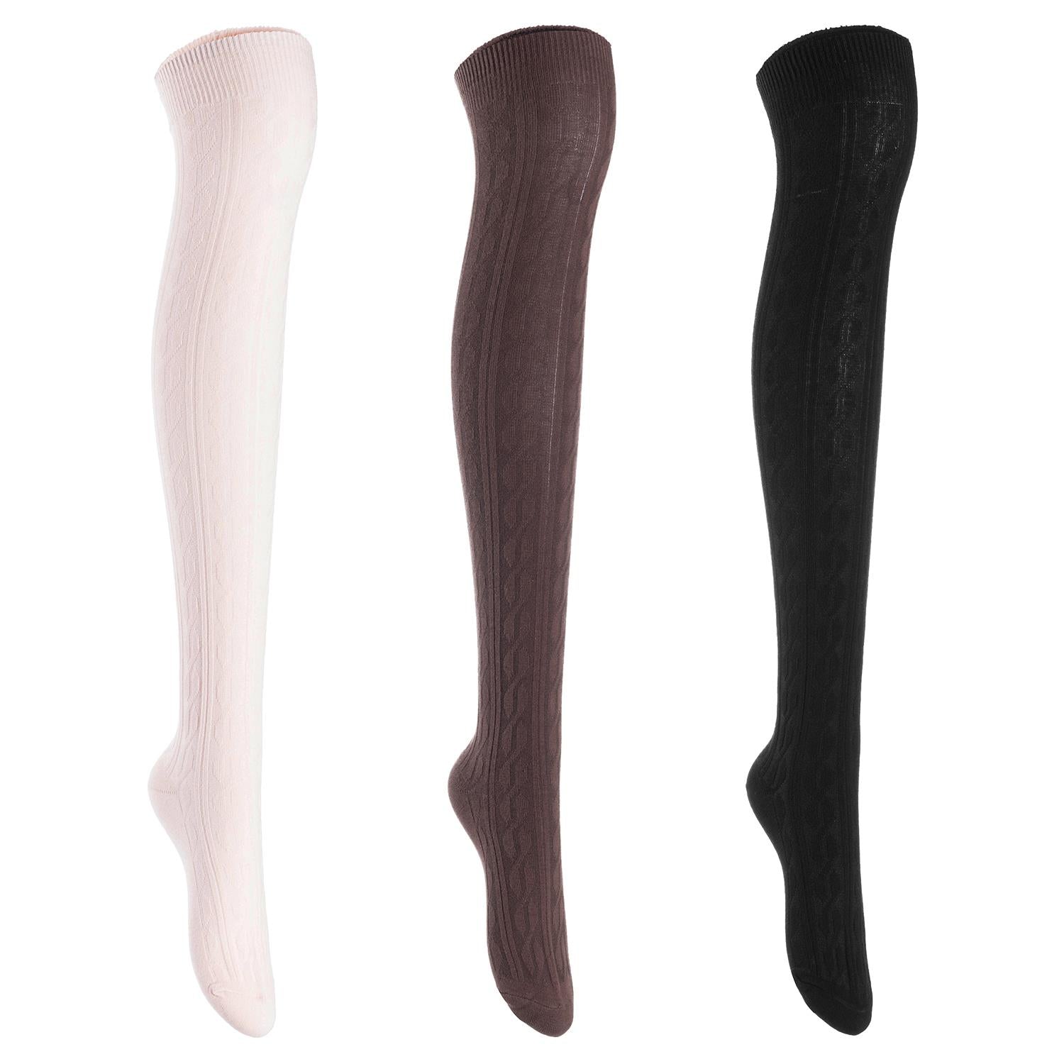 Lian LifeStyle Exquisite Big Girl's Women's 3 Pairs Thigh High Cotton Socks. Super Comfortable Female Socks in Vibrant Colors 6-9 L1024 (Black,Coffee,Beige)