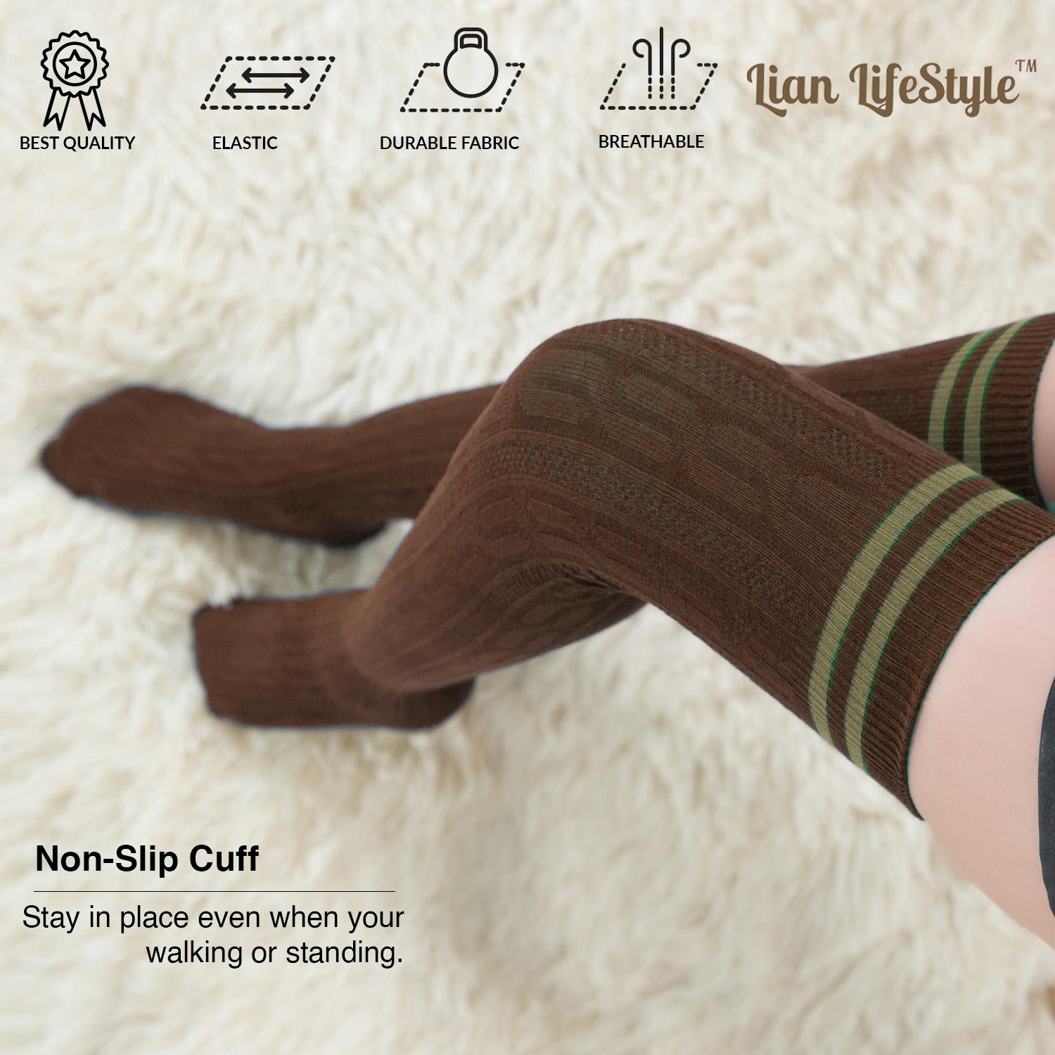 Lian LifeStyle Exquisite Big Girl's Women's 3 Pairs Thigh High Cotton Socks. Super Comfortable Female Socks in Vibrant Colors Size 6-9 L1023(Coffee)