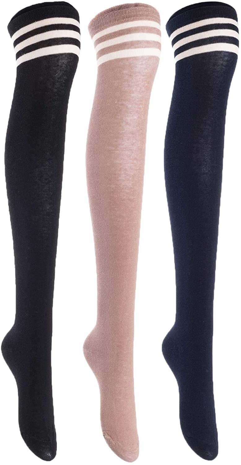Lian LifeStyle Women's 3 Pairs Adorable Comfortable Soft Thigh High Over Knee High Cotton Socks Size 6-9 L1022(Black, Kakhi, Navy)