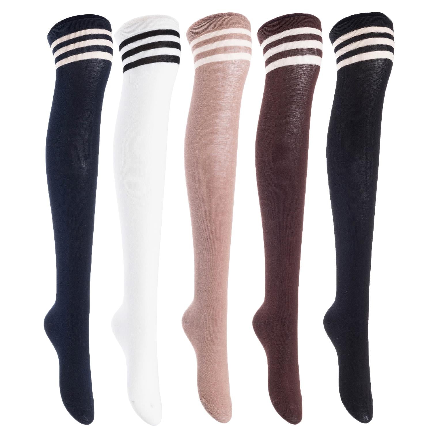Lian LifeStyle Women's 5 Pairs Adorable Comfortable Soft Thigh High Over Knee High Cotton Socks Size 6-9 L1022(Black,Coffee,Khaki,White,Nvy)