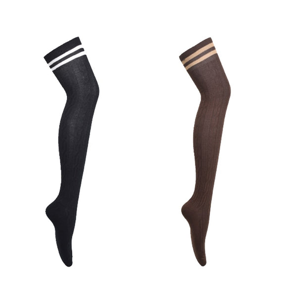 Lian Style Women's 2 Pairs Incredible Durable Super Soft Unique Over Knee High Thigh High Cotton Socks Size 6-9 J1023 (Black, Coffee)