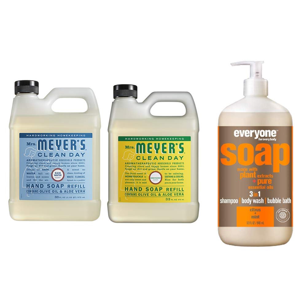 Liquid Hand Soap Refill, 1 Pack Rain water, 1 Pack Honey Suckle, 33 OZ each include 1, 32 OZ Bottle of Bath & Shower Gel Soap, Citrus/Mint