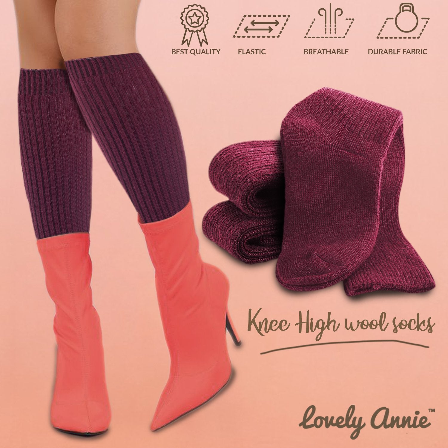 Lovely Annie Big Girl's & Women's 2 Pairs Knee High Wool Socks | Comfy, Cozy and Fancy Leg Warmer Stockings AFS05 Size L/XL(Wine)