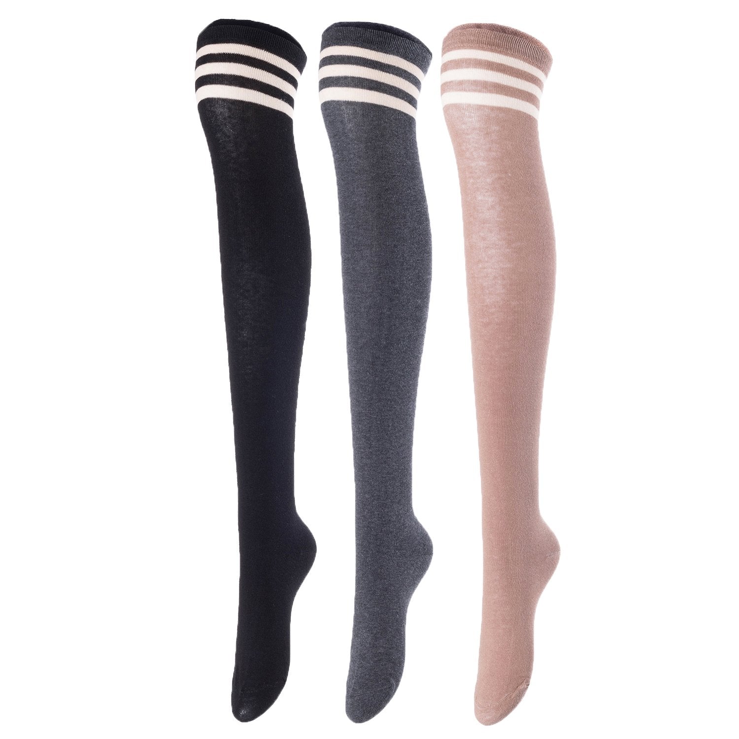 Lovely Annie Big Girl's Women's 3 Pairs Incredible Durable Super Soft Unique Over Knee High Thigh High Cotton Socks Size 6-9 A1022(Black,DG,Khaki)