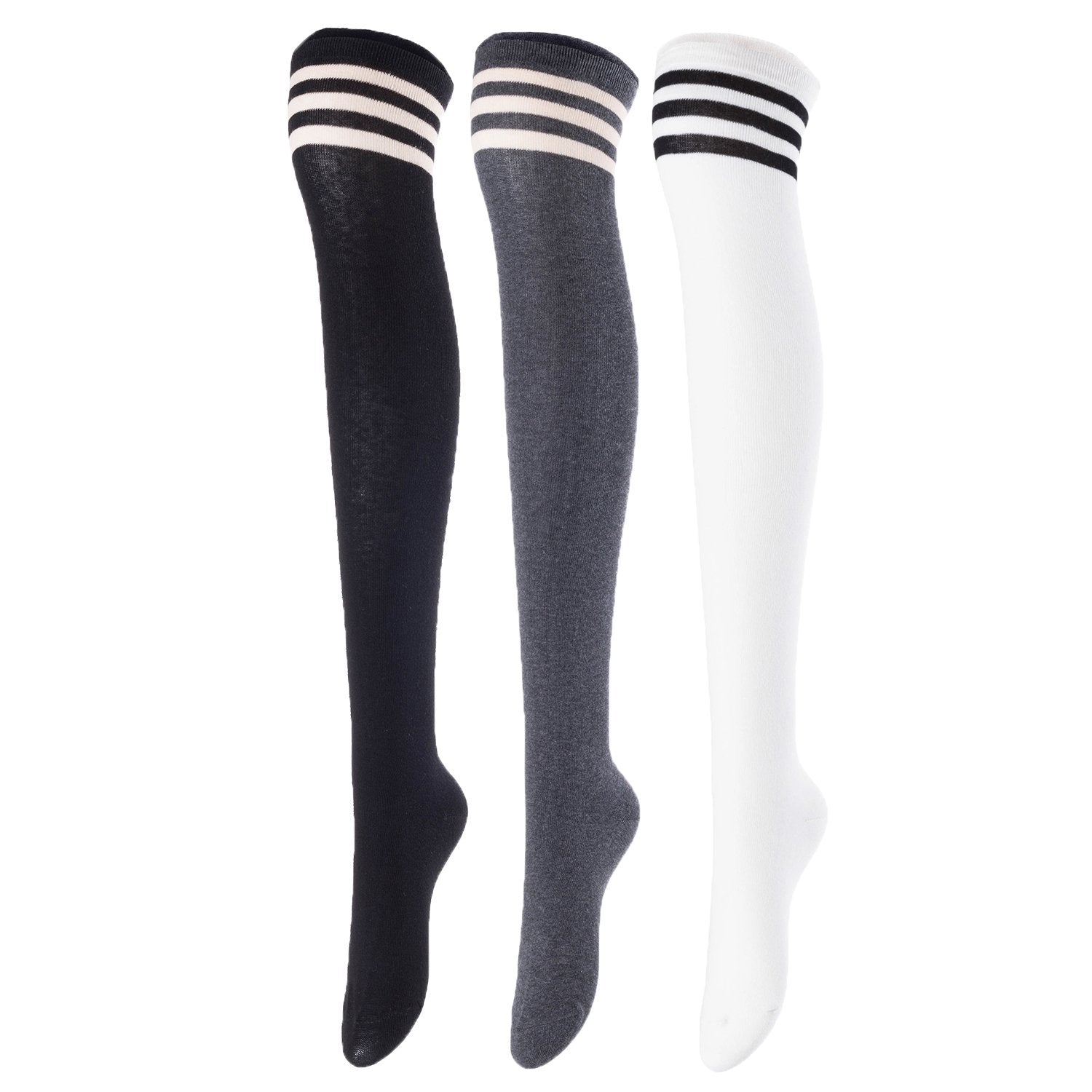 Lovely Annie Big Girl's Women's 3 Pairs Incredible Durable Super Soft Unique Over Knee High Thigh High Cotton Socks Size 6-9 A1022(Black,DG,White)