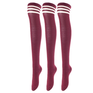 Lovely Annie Big Girl's Women's 3 Pairs Incredible Durable Super Soft Unique Over Knee High Thigh High Cotton Socks Size 6-9 A1022(Wine)