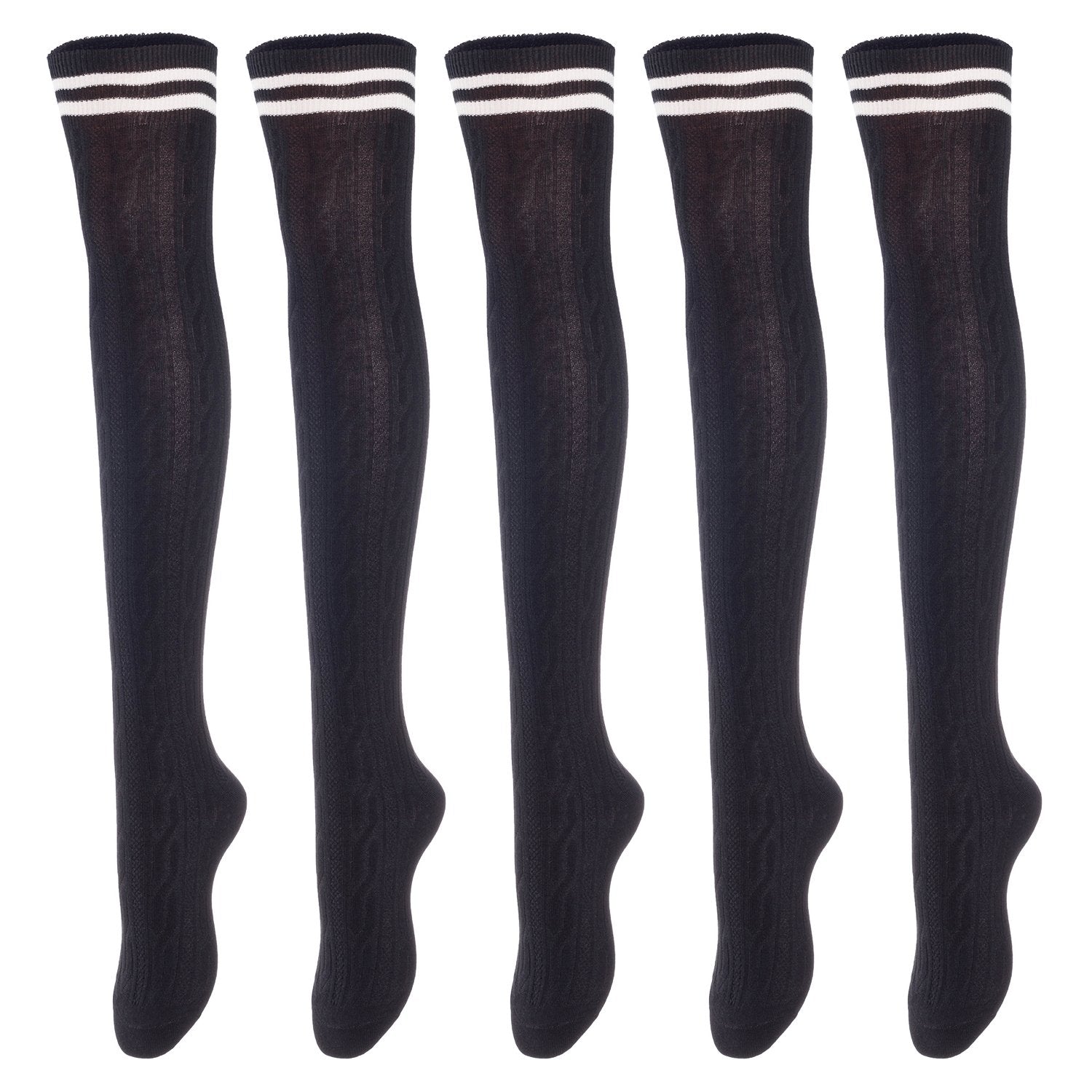 Lovely Annie Big Girl's Women's 5 Pairs Incredible Durable Super Soft Unique Over Knee High Thigh High Cotton Socks Size 6-9 A1023(Blk,Cof,DG,Kaki,Wite)