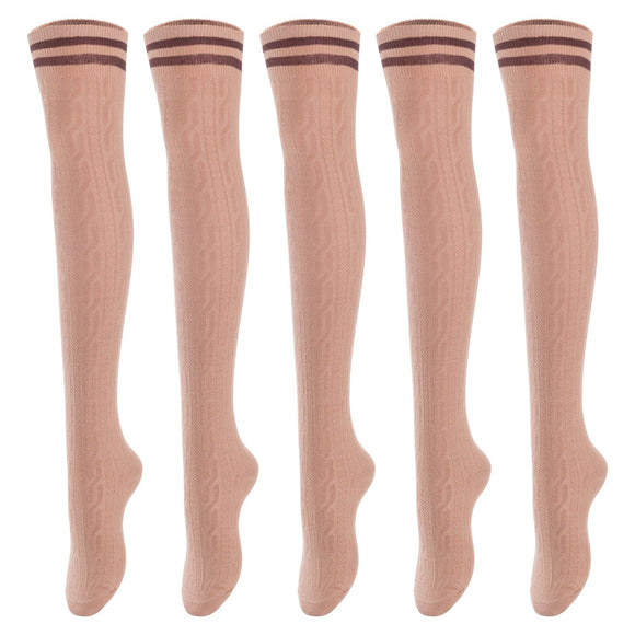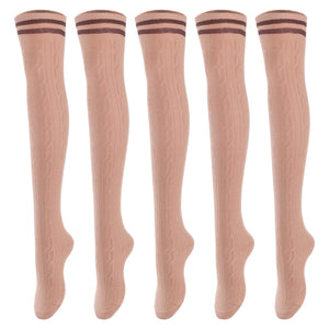 Lovely Annie Big Girl's Women's 5 Pairs Incredible Durable Super Soft Unique Over Knee High Thigh High Cotton Socks Size 6-9 A1023(Khaki)