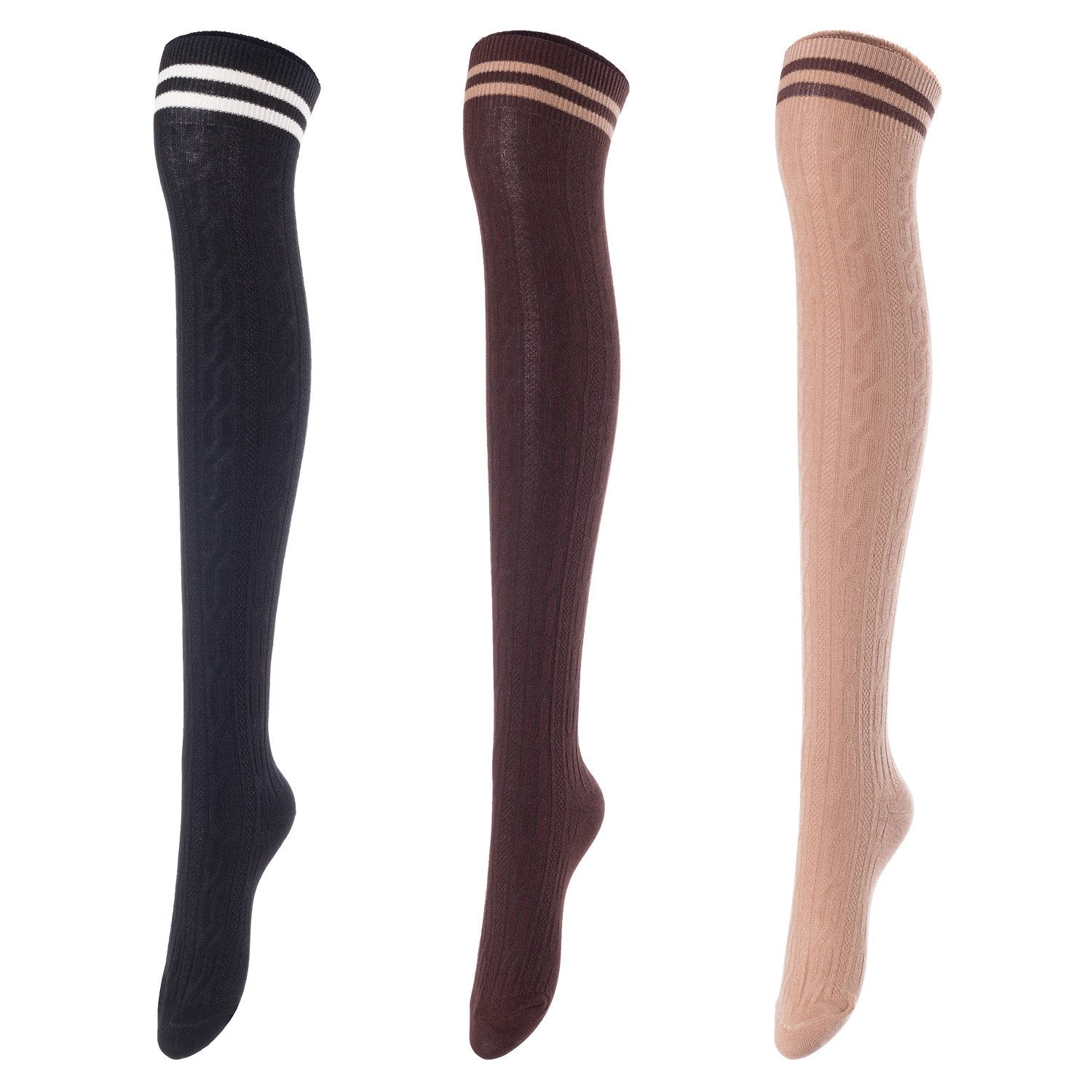 Lovely Annie Women's 3 Pairs Incredible Durable Super Soft Unique Over Knee High Thigh High Cotton Socks Size 6-9 A1023(Black,Coffee,Khaki)