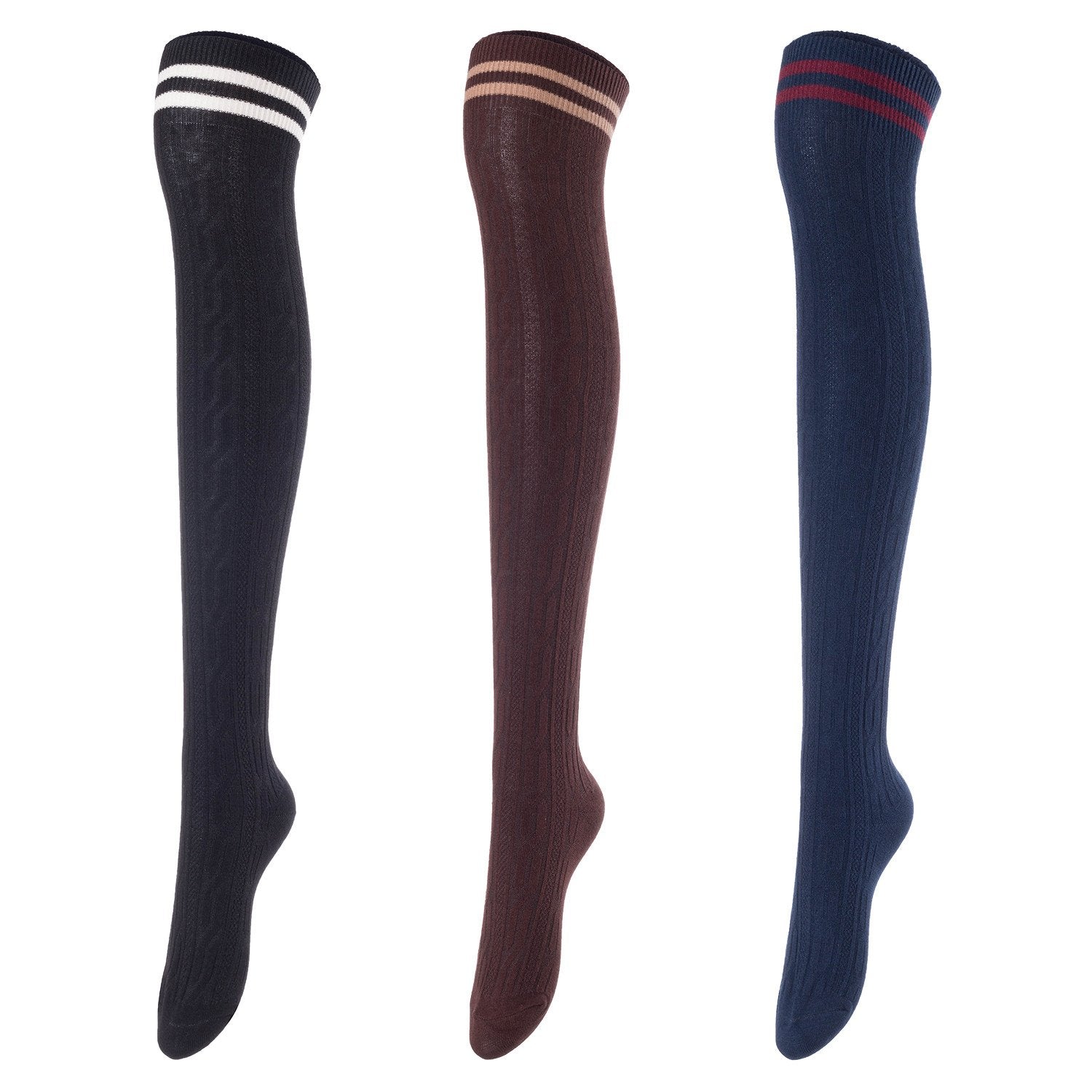 Lovely Annie Women's 3 Pairs Incredible Durable Super Soft Unique Over Knee High Thigh High Cotton Socks Size 6-9 A1023(Black,Coffee,Navy)