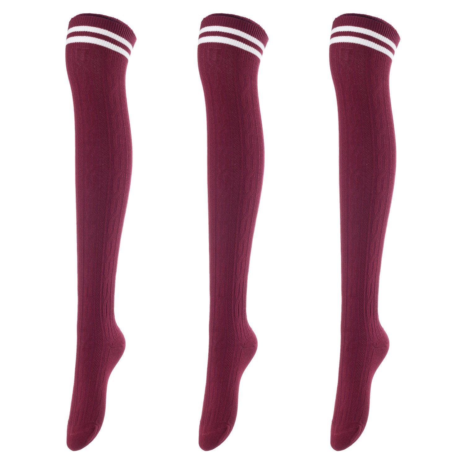 Lovely Annie Women's 3 Pairs Incredible Durable Super Soft Unique Over Knee High Thigh High Cotton Socks Size 6-9 A1023(Wine)
