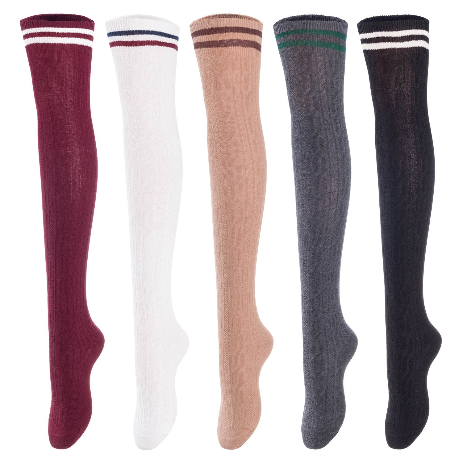 Lovely Annie Women's 5 Pairs Incredible Durable Super Soft Unique Over Knee High Thigh High Cotton Socks Size 6-9 A1023(Black,Khaki,White,Navy,Wine)