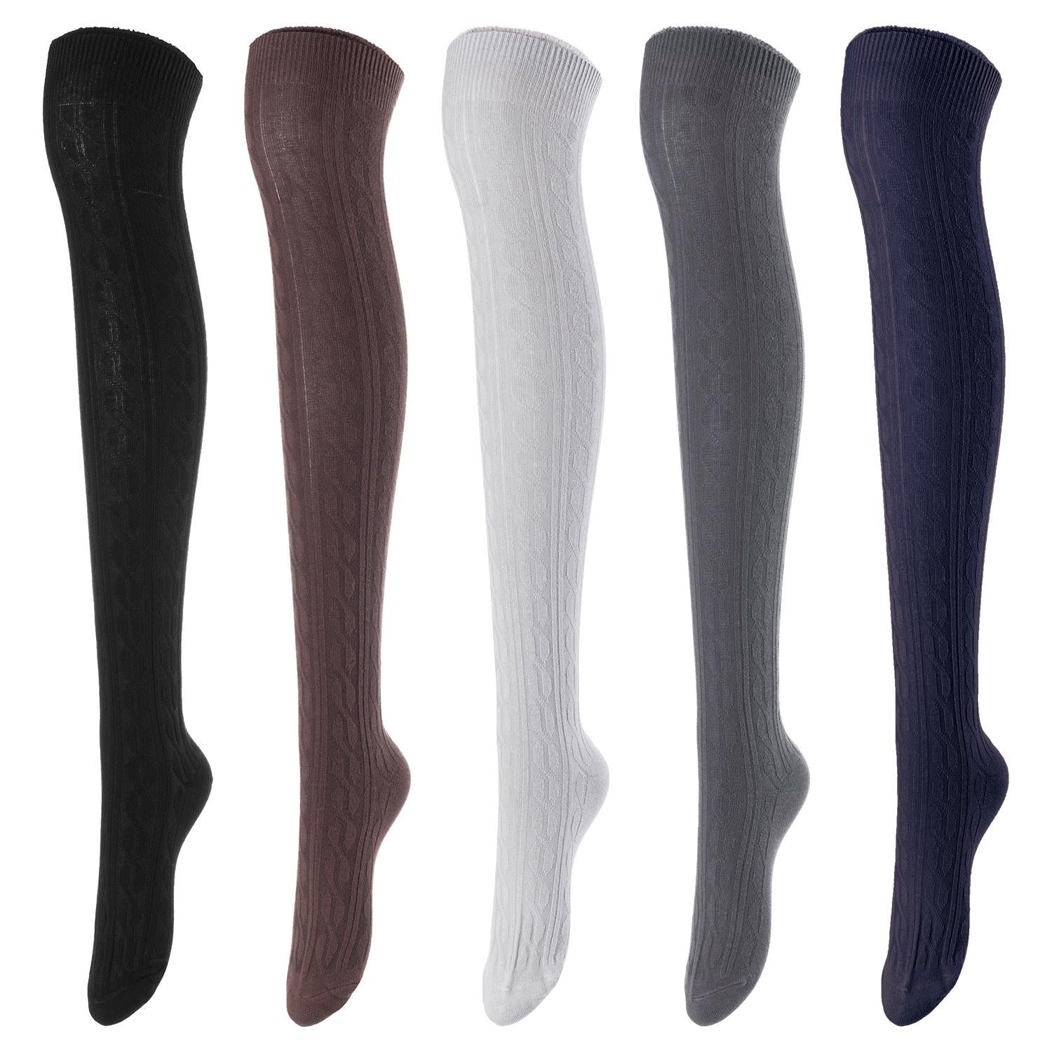 Lovely Annie Women's 5 Pairs Incredible Durable Super Soft Unique Over Knee High Thigh High Cotton Socks Size 6-9 A1024(Black,Coffee,Grey,DG,Navy)