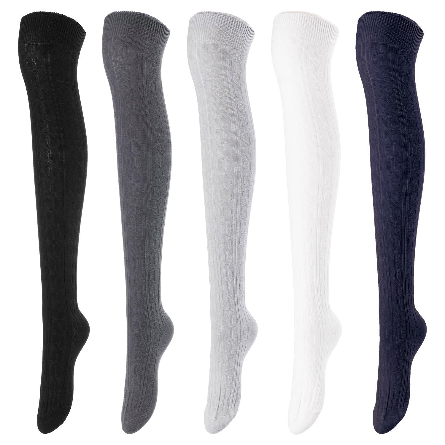 Lovely Annie Women's 5 Pairs Incredible Durable Super Soft Unique Over Knee High Thigh High Cotton Socks Size 6-9 A1024(Black,DG,Grey,Cream,Navy)