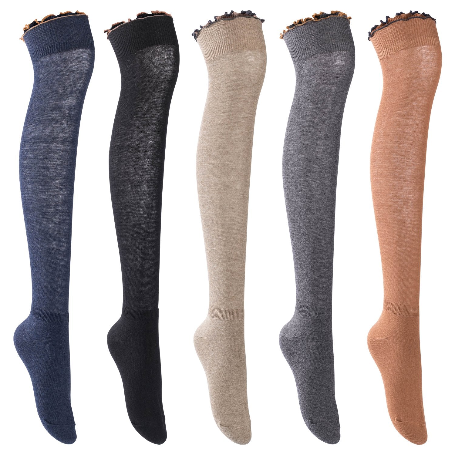 Lovely Annie Women's 5 Pairs Incredible Thigh High Cotton Boot Socks L1856 Size 5-11 5P5C-1(Black, Navy Blue, Beige, Turmeric, Dark Grey)