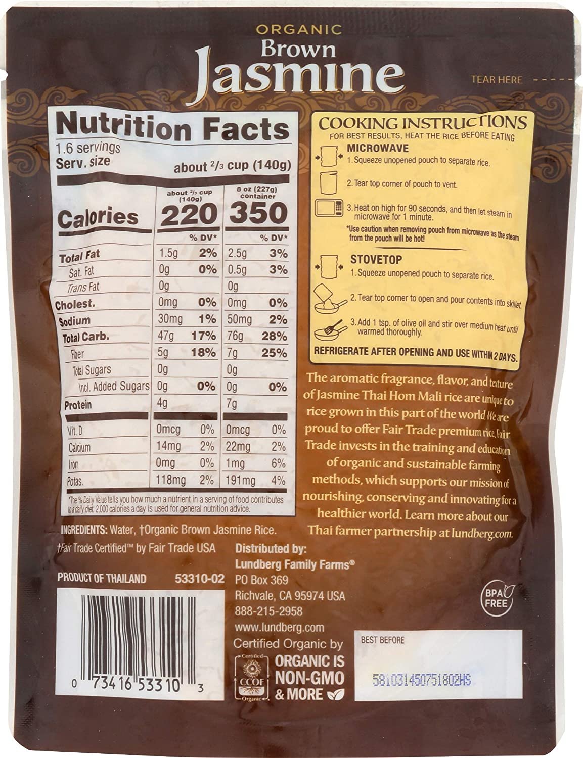 Lundberg Organic Fully Cooked & Ready To Heat Rice, Brown Jasmine Thai Hom Mali Rice, 8 Oz, Gluten-Free, Vegan, Usda Organic, Non-GMO, Fair Trade, 8 Oz