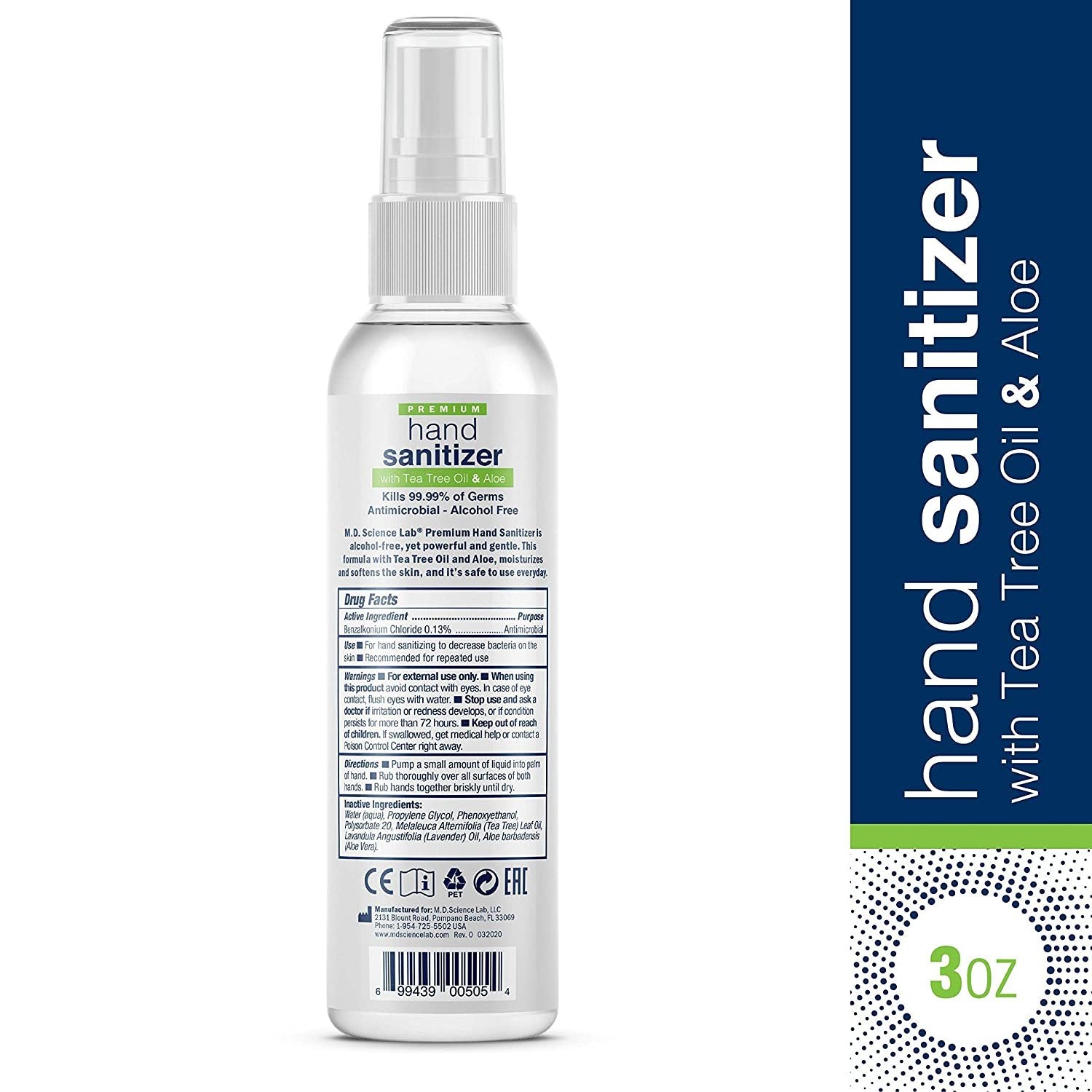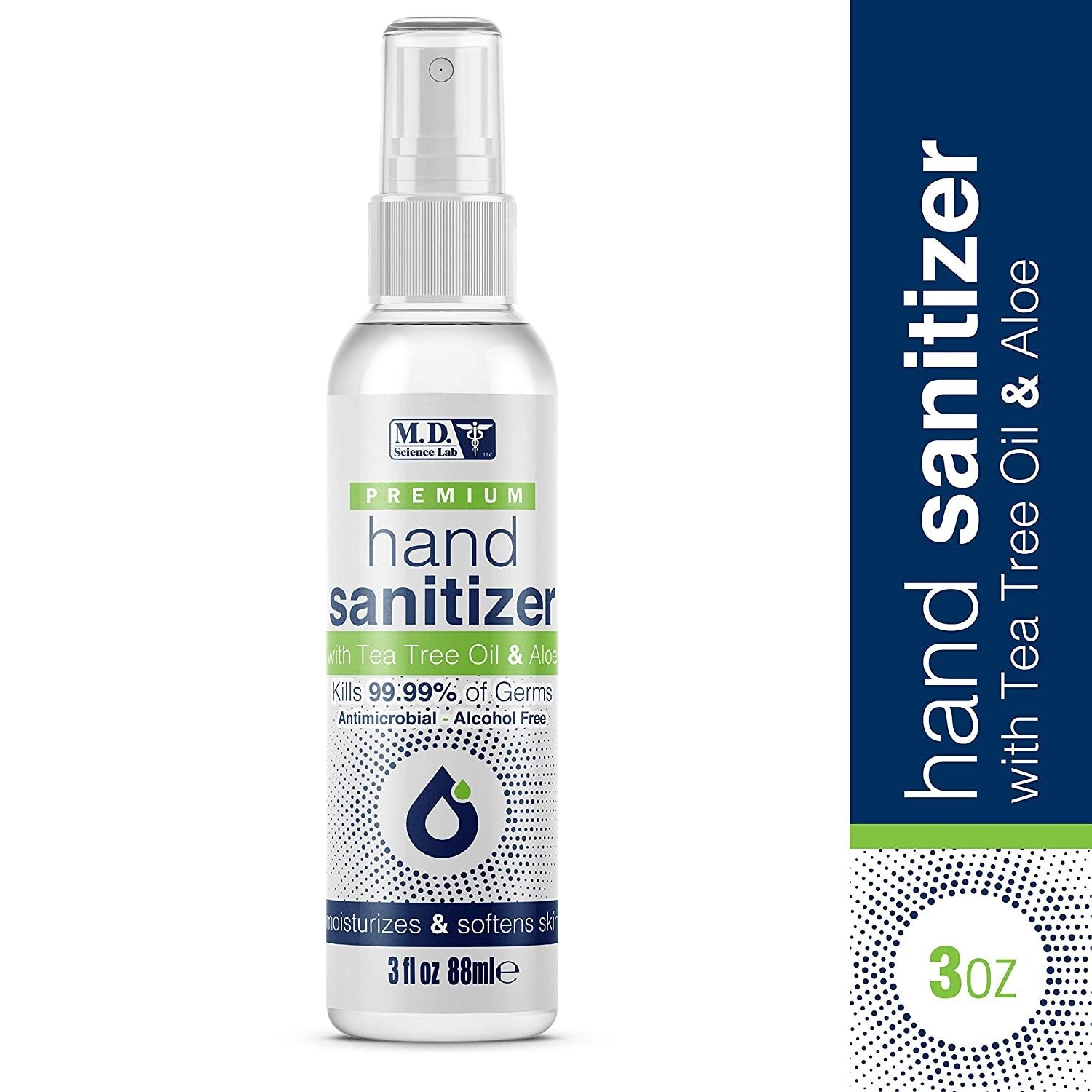 M.D. Science Premium Alcohol-Free Hand Sanitizing Spray with Tea Tree Oil and Aloe Vera is an effective formula. The formula not only moisturizes your skin, but also makes it softer. This non-toxic and non-flammable liquid solution leaves your skin smoother and does not require washing or drying after use. M.D. Science Lab products are made in the USA and committed to keeping you and your family clean, safe, and healthy every day.