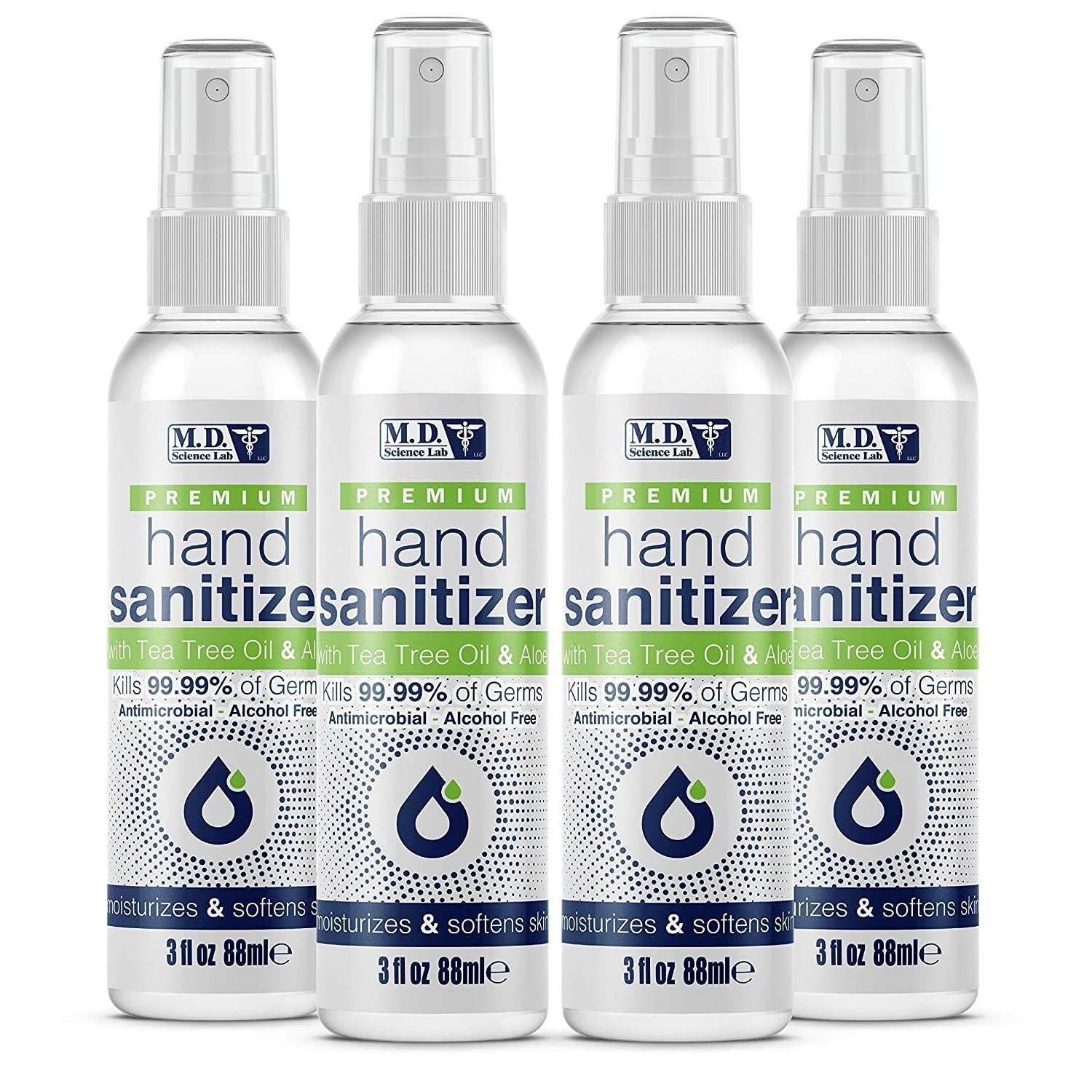 M.D. Science Premium Alcohol Free Hand Sanitizer with Benzalkonium Chloride, Tea Tree Oil and Aloe Vera, 3 fl Oz. (Pack of 4)