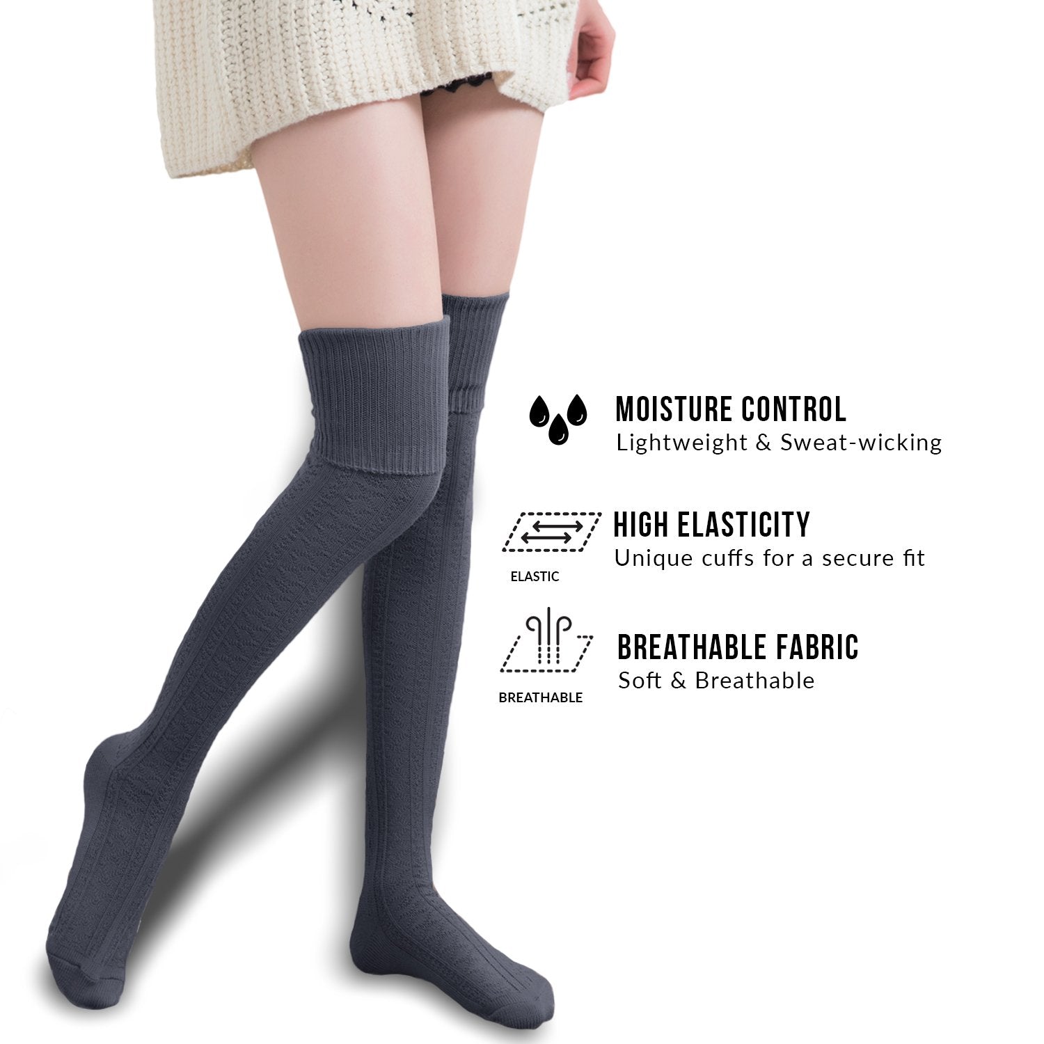 Measurement from toe to the top of sock: 32"; the leg: 26". These women thigh high/high crew socks are with medium width and are very comfortable and soft. They stay well at your knee area even after multiple washes! Our fashion thigh high cotton socks at a great price point to help more women to be able to show their beautiful legs with different boots and clothes all season long!