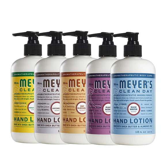 Mrs. Meyers Clean Day Hand Lotion, 1 Pack Honeysuckle, 1 Pack Lavender, 1 Pack Geranium, 1 Pack Plumbery, 1 Pack Rainwater, 12 OZ each