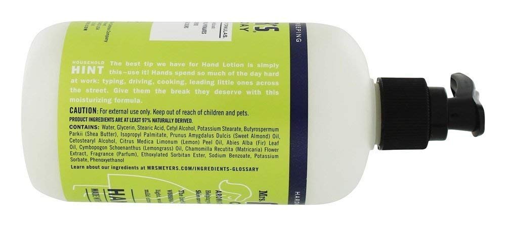 Mrs. Meyer's Clean Day Hand Lotion is made with sweet almond oil and shea butter to help soften the driest hands without a greasy or heavy feeling. Give your hard working hands the break they deserve with this moisturizing formula.