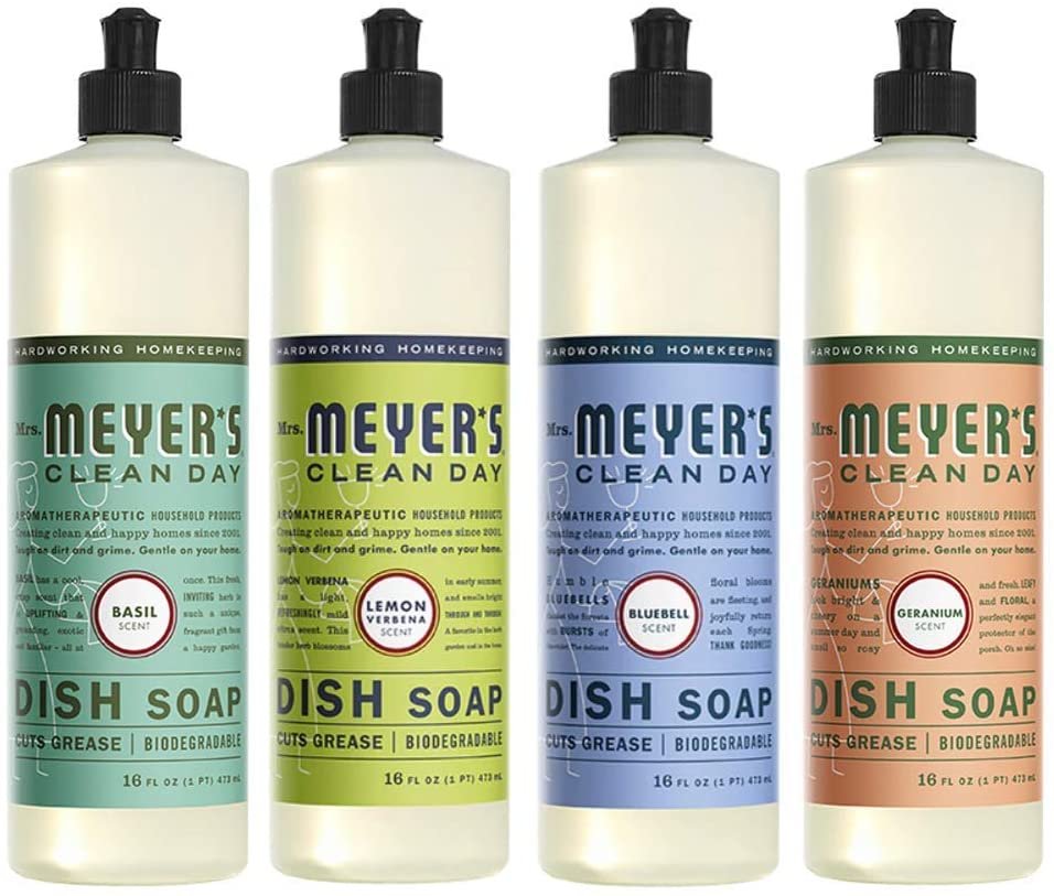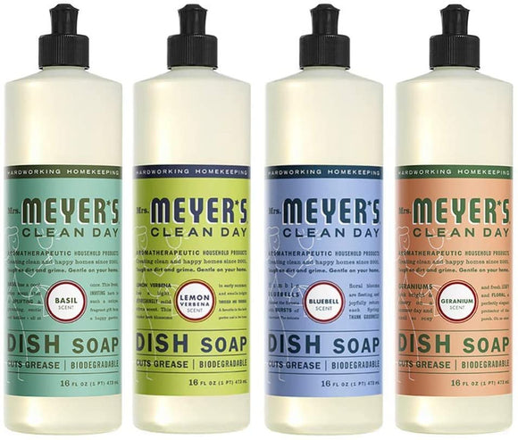 Mrs. Meyers Clean Day Liquid Dish Soap, 1 Pack Basil, 1 Pack Lemon Verbena, 1 Pack Bluebell, 1 Pack Geranium, 16 OZ each
