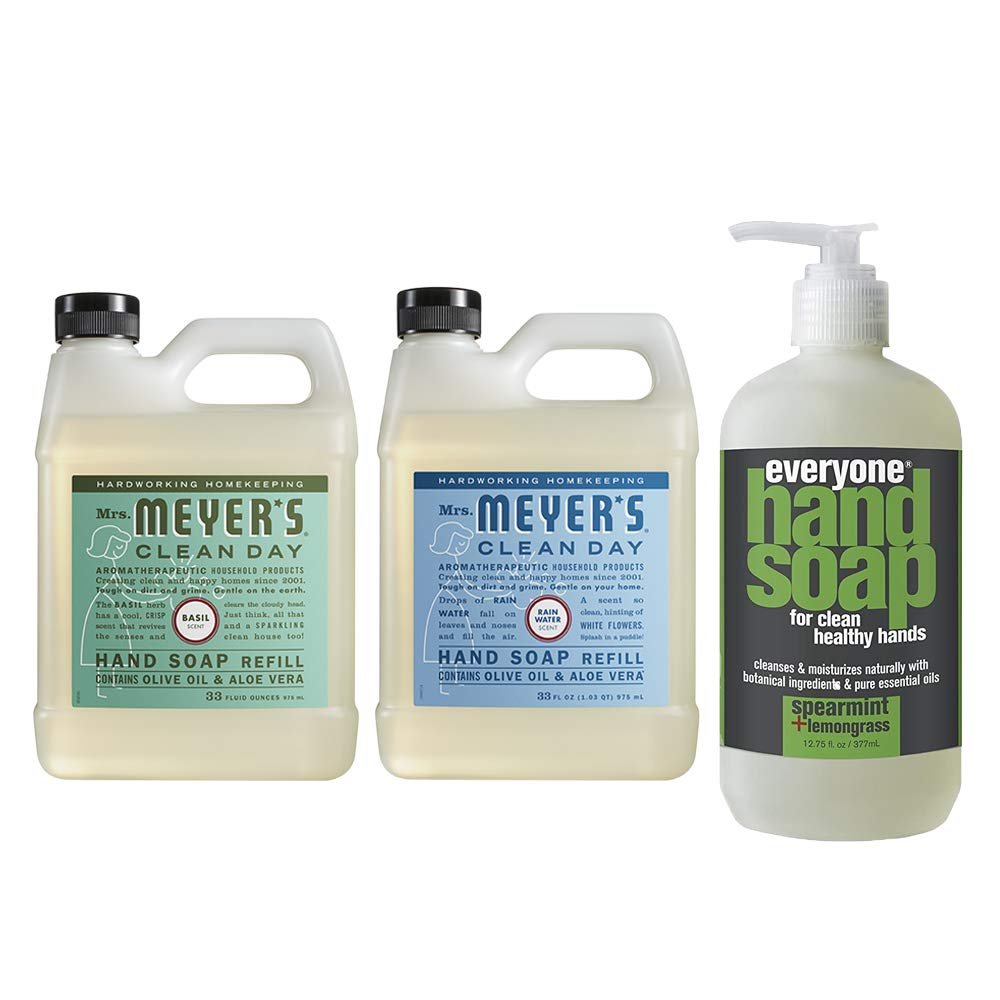 Mrs. Meyers Clean Day Liquid Hand Soap Refill, 1 Pack Basil, 1 Pack Rain water, 33 OZ each include 1 12.75 OZ Bottle of Hand Soap Spearmint + Lemongrass