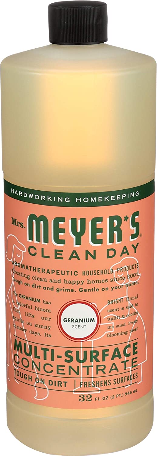 MRS. MEYER'S CLEAN DAY geranium multi-surface concentrate is tough on dirt and freshens surfaces with plant-derived ingredients and natural essential oils. Our effective formula is free of chlorine, formaldehyde and parabens. Each 32 ounce bottle of multi-surface concentrate is certified cruelty-free.