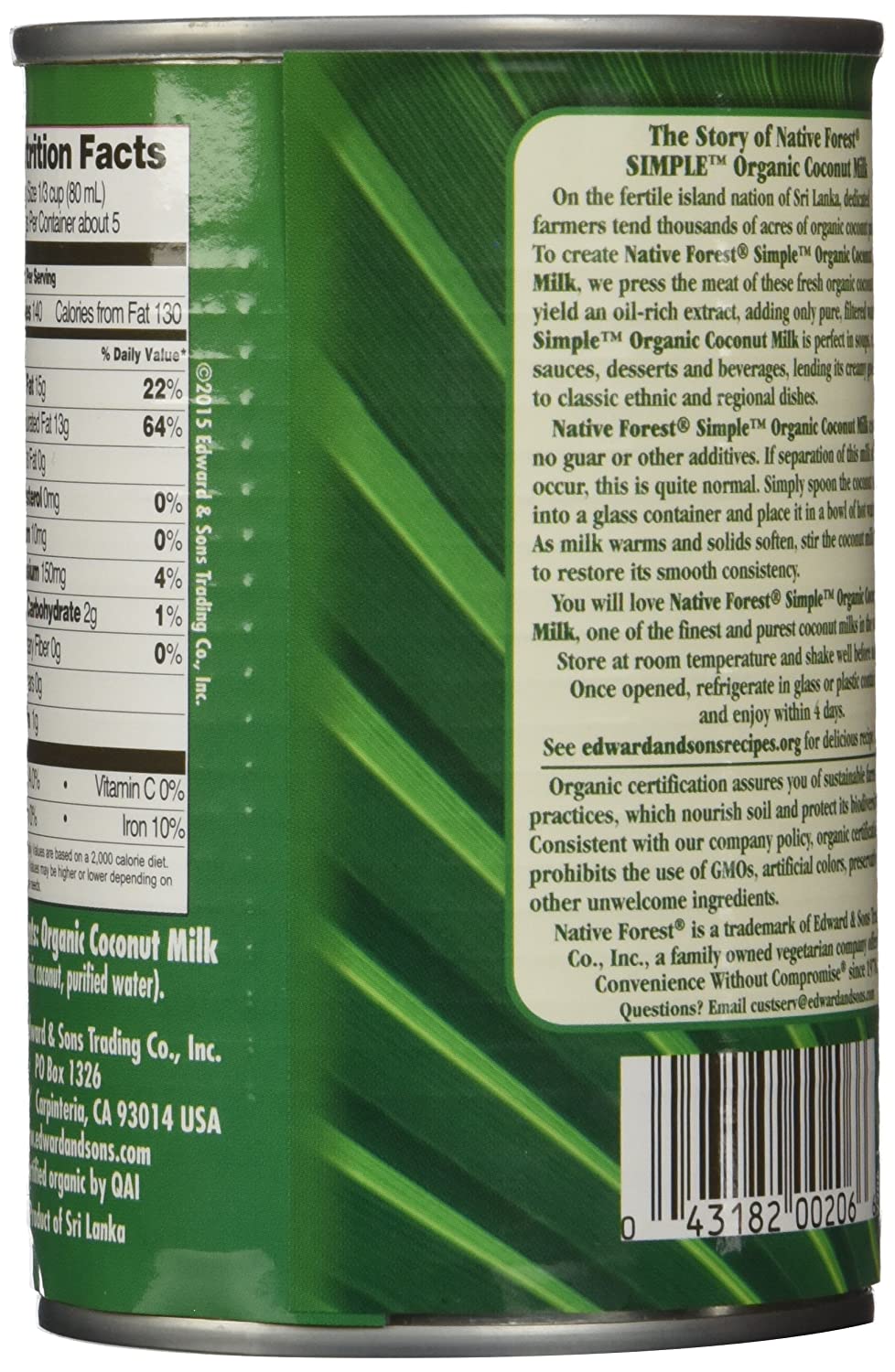 On the fertile island nation of sri lanka, dedicated farmers tend thousands of acres of organic coconut palms. To create native forest simple organic coconut milk, we press the meat of these fresh organic coconuts to yield an oil-rich extract, adding only pure, filtered water. Simple organic coconut milk is perfect in soups, curries, sauces, desserts and beverages, lending its creamy goodness to classic ethnic and regional dishes. Native forest simple organic coconut milk contains no guar or other additives. If separation of this milk should occur, this is quite normal. Simply spoon the coconut milk into a glass container and place it in a bowl of hot water. As milk warms and solids soften, stir the coconut milk well to restore its smooth consistency. You will love native forest simple organic coconut milk, one of the finest and purest coconut milks in the world.