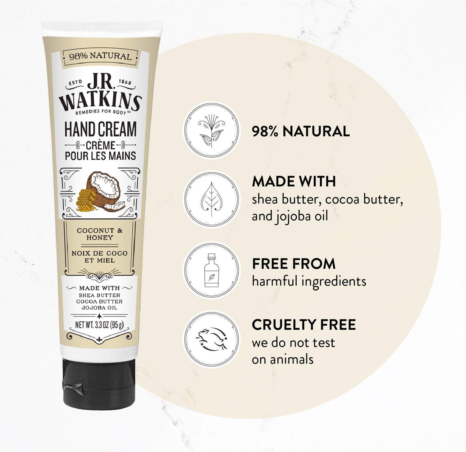 Natural Moisturizing Hand Cream, Coconut, Hydrating, Hand Moisturizer with Shea Butter, Cocoa Butte and Avocado Oil, USA Made, Cruelty Free, Pack of 2, 3.3 Fl OZ Per Pack