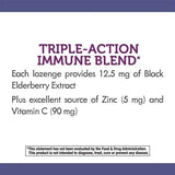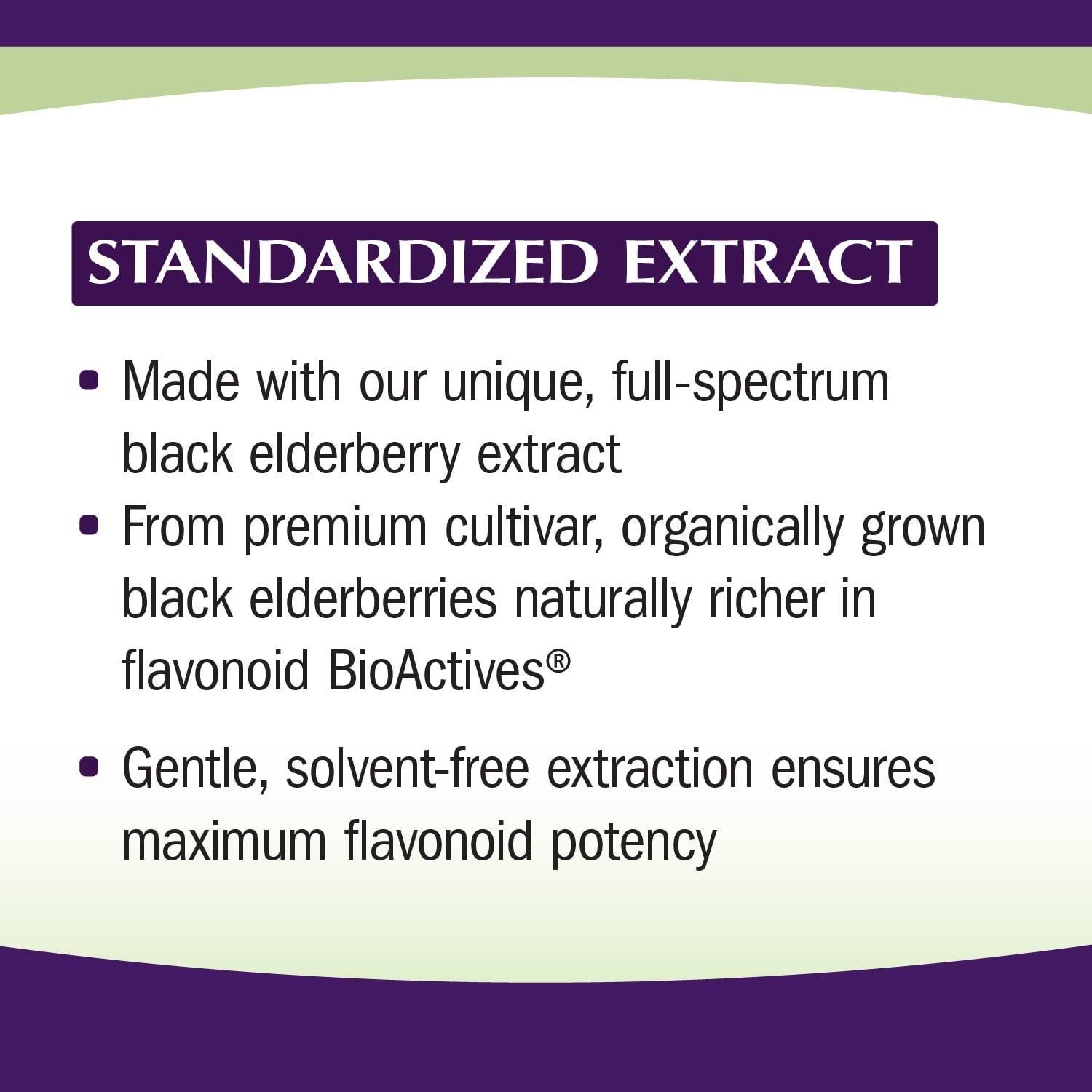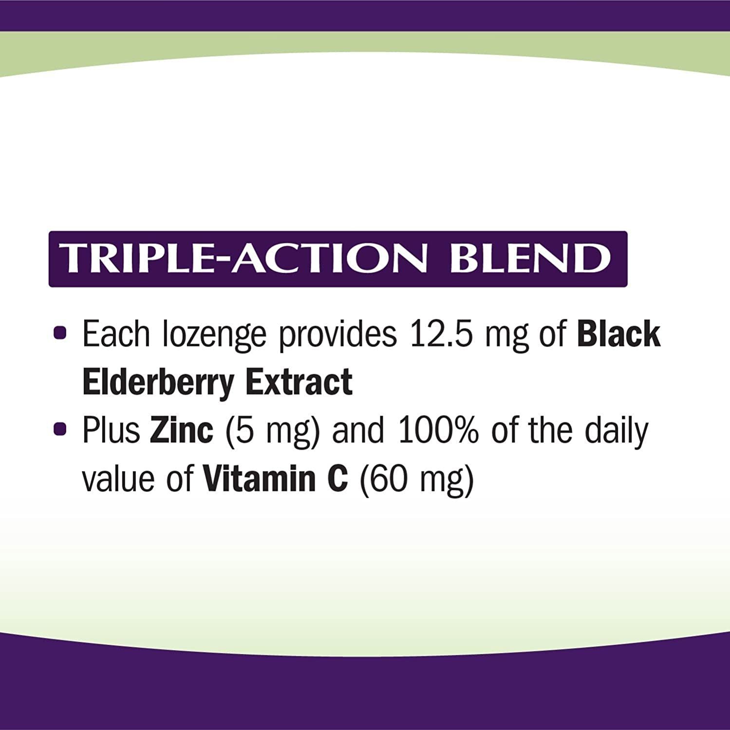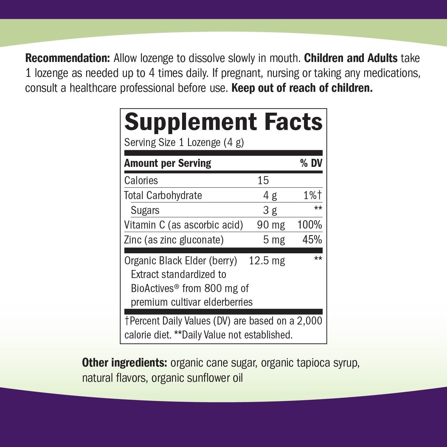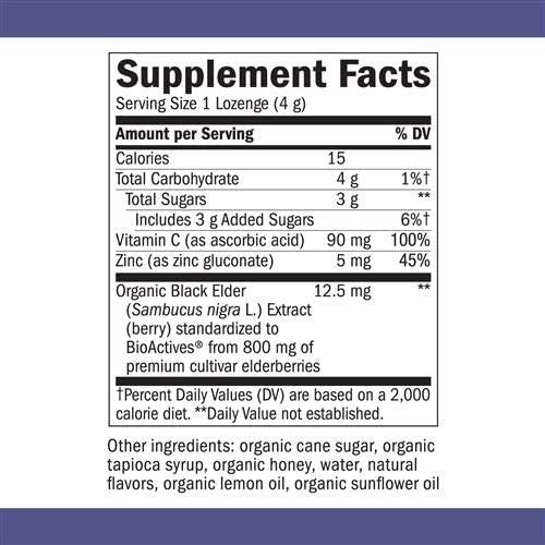 Standardized Extract. Made with our unique, full-spectrum black elderberry extract. From a unique blend of blackberries naturally richer in Flavonoid BioActives. Gentle, solvent-free extraction ensures maximum flavonoid potency. Triple-Action Blend. Each lozenge provides 12.5 mg of Black Elderberry Extract. Plus Zinc (5 mg) and 100% of the daily value of Vitamin C (90 mg). Great Taste. Delicious honey lemon flavor. Sweetened with organic tapioca syrup and organic cane sugar. No artificial preservatives, flavors or colors.