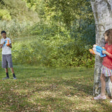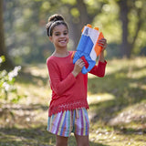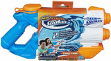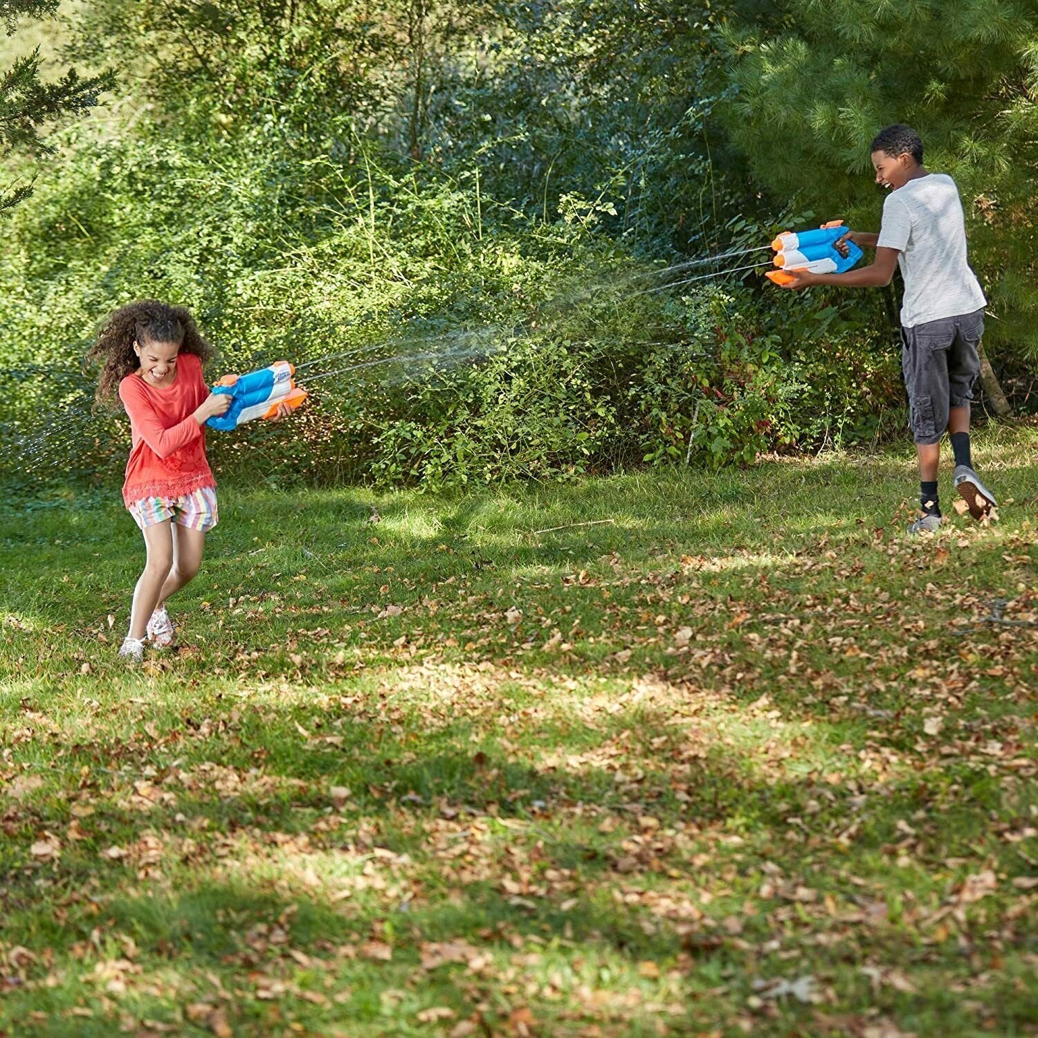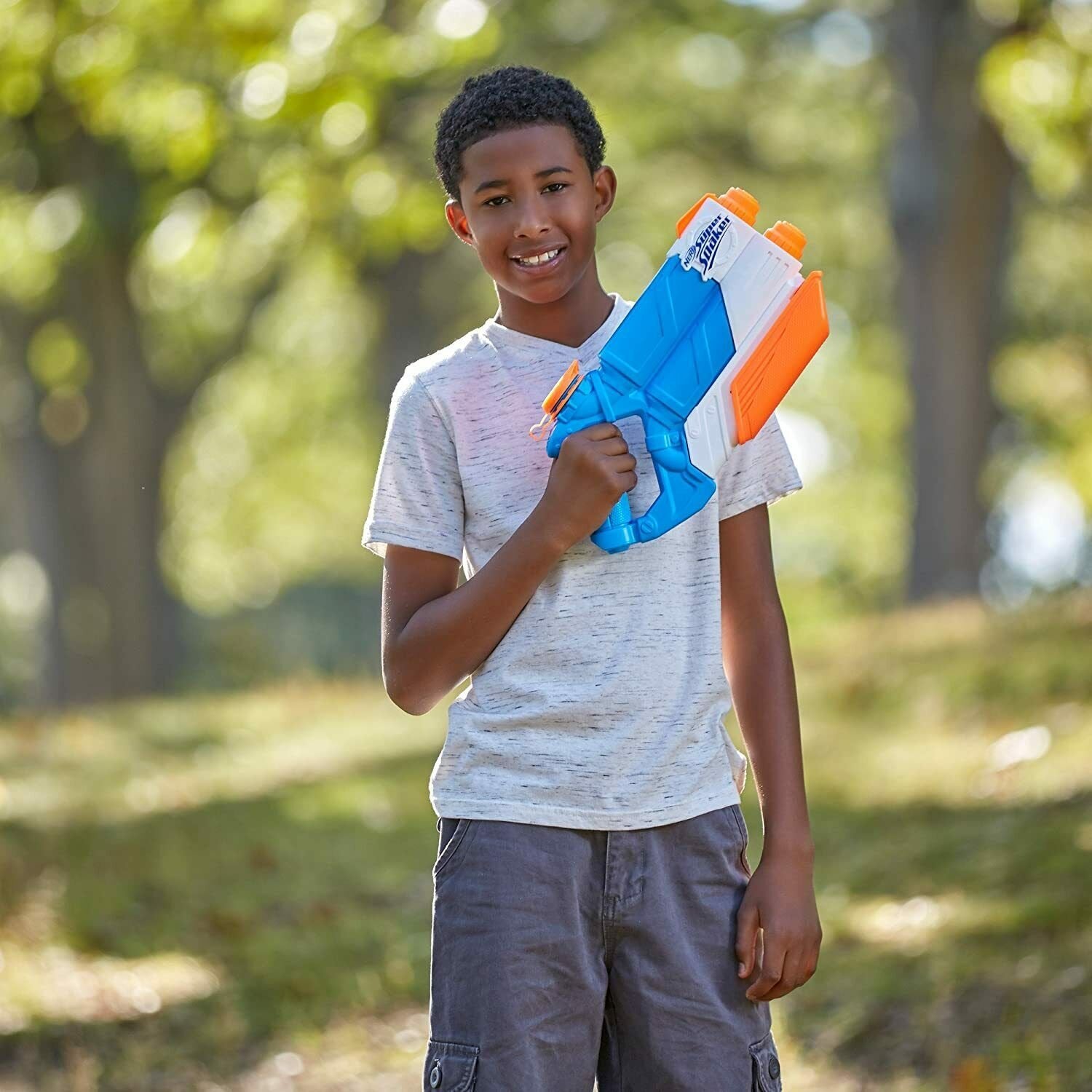 Take on the competition with a double shot of soakage! The Nerf Super Soaker Twin Tide water blaster has 2 barrels so battlers can blast 2 streams of water at once. Fill the tank and pump to unleash waves of water from both barrels! The Super Soaker Twin Tide water blaster holds up to 33 fluid ounces (975 milliliters).