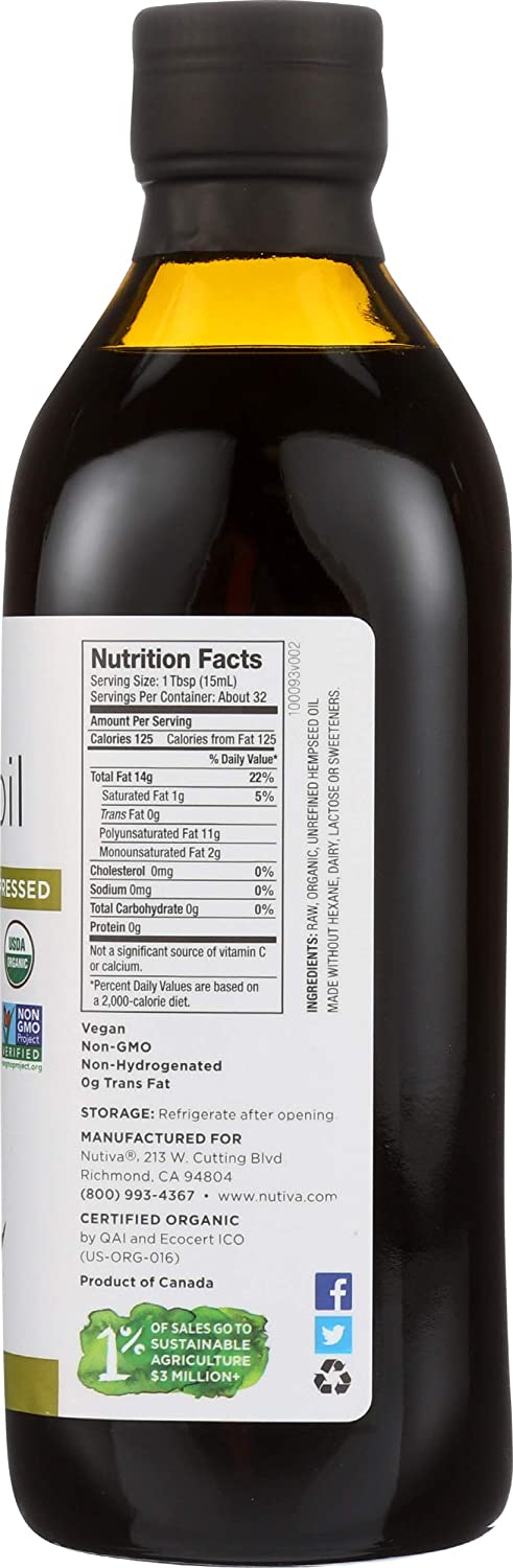Nutiva Organic, cold-pressed, unrefined hemp oil from Non-GMO, sustainably farmed Canadian hemp contains the ideal ratio of Omega 6 to Omega 3 fats. Unlike other oils on the market, Nutiva Organic, cold-pressed, unrefined hemp oil is never refined, deodorized or bleached. At Nutiva, we start with organic, non-GMO, sustainably grown hemp seeds, harvested and cold pressed to naturally extract an oil rich in essential fatty acids, antioxidants and chlorophyll. The mild aroma and fresh nutty flavor make it great for enhancing your favorite recipes. It's ideal as a low-heat cooking oil, or raw as a nutritious dressing. Nutiva Organic, cold-pressed, unrefined hemp oil is a healthful addition to vegetarian, vegan, raw, whole food, paleo, ketogenic, and gluten-free diets. Nutiva was founded in 1999 with a single purpose in mind - to revolutionize the way the world Eats. Our role is to produce and promote organic, nutrient dense superfoods that are good for you and good for the planet. Social and environmental responsibility is a core part of Nutiva culture and business. From sourcing organic products, to obtaining fair Trade certification, to greening our facilities and operations, to funding tree planting at schools in our local community, we are constantly seeking ways to better protect our environment and ensure a better quality of life for employees, customers, and the communities we serve.