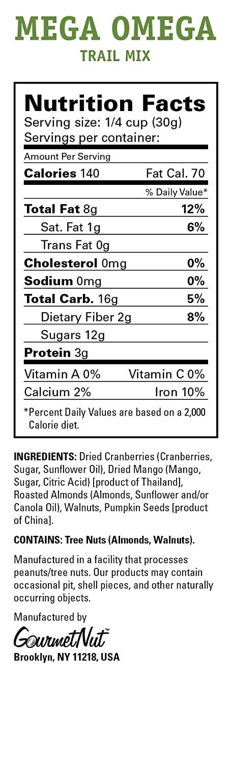 Our Mega Omega mix is a delicious blend of nuts, fruits and seeds. Walnuts and almonds provide you with Omega-3 and -6 “heart-healthy” fatty acids, while the Mango and cranberries are a source of antioxidants. Add a dash of protein and vitamin B rich pumpkin seeds and you’ve got the perfect, healthful snack.
