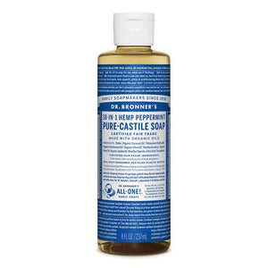 Our most popular scent—with a peppermint burst so pure it tingles! Scented with organic peppermint oil to cool skin, clear sinuses and sharpen the mind. Our Peppermint Pure-Castile Liquid Soap is concentrated, biodegradable, versatile and effective. With 18-in-1 uses, these soaps are perfect for your face, body, and hair, but can also be used for rinsing food, cleaning dishes, mopping, and doing laundry. With no synthetic preservatives, detergents, or foaming agents, they are even safe enough for your pets! Our Pure-Castile soaps are never tested on animals and completely cruelty-free. Made with organic and certified fair trade ingredients, packaged in a 100% post-consumer recycled bottle. All-One!
