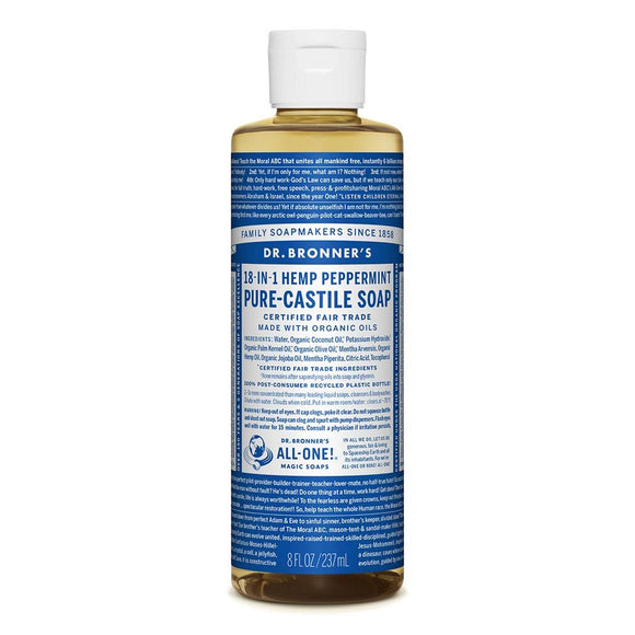 Our most popular scent—with a peppermint burst so pure it tingles! Scented with organic peppermint oil to cool skin, clear sinuses and sharpen the mind. Our Peppermint Pure-Castile Liquid Soap is concentrated, biodegradable, versatile and effective. With 18-in-1 uses, these soaps are perfect for your face, body, and hair, but can also be used for rinsing food, cleaning dishes, mopping, and doing laundry. With no synthetic preservatives, detergents, or foaming agents, they are even safe enough for your pets! Our Pure-Castile soaps are never tested on animals and completely cruelty-free. Made with organic and certified fair trade ingredients, packaged in a 100% post-consumer recycled bottle. All-One!