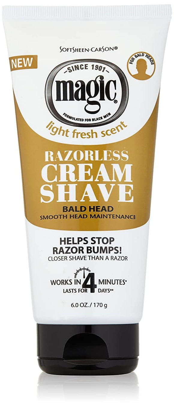 Razorless cream shave formulated to help stop razor bumps and give a closer shave than a razor. With a light fresh scent. Works in 4 minutes and lasts for 4 days. For smooth head maintenance. • Reformulated with a light, fresh scent • The more you use Magic Shave the better it works • Lasts up to 4 days • We believe in beauty without compromise Before using Magic Cream Shave for the first time, the following test must be performed. Wait at least 36 hours after using a razor or depilatory product before doing this test. Apply cream to a quarter size area of the beard Wait 4 minutes before removing. Do not scrape. Rinse area thoroughly. After 24 hours, if there is no sign of irritation or redness follow directions on product. IMPORTANT: Contains Thioglycolate. If skin is inflamed or has abrasions, sores or pustules, consult a dermatologist before use. Conduct sensitivity test before use. Wait 36 hours after using any razor or shaving powder. Do not use with any after shave product containing alcohol. Only for use on the head. This is a safety summary. Read all product labeling and instructions completely.