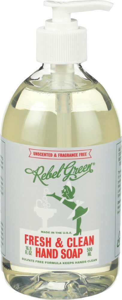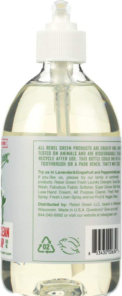 Rebel Green - Fresh & Clean Hand Soap Lavender Grapefruit - 16.9 oz. (500 mL) Rebel Green Fresh & Clean Hand Soap Lavender Grapefruit isa natural plant based formula thatkeeps hands soft. Hardworking and naturally moisturizing with aloe vera and vitamins A and E. Pure essential oils. No synthetic fragrances. Join the Natural Cleaning Revolution! Rebel Green offers a full line of natural cleaning products