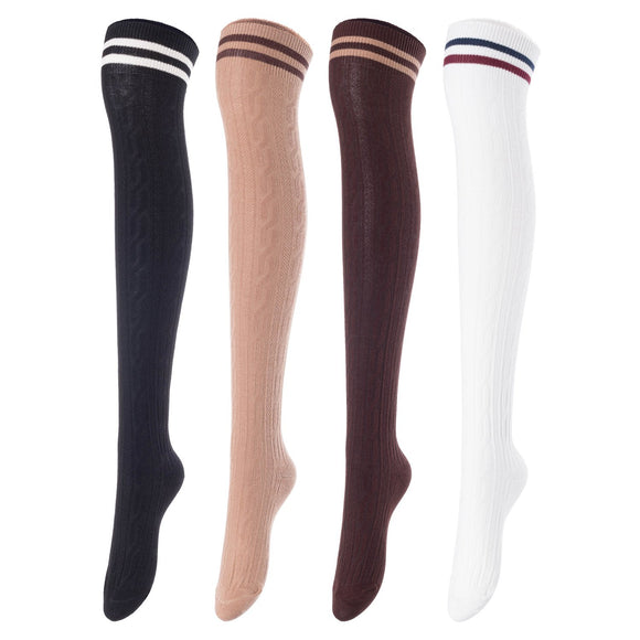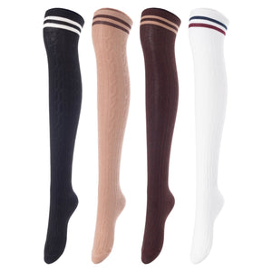 Remarkable Big Girls' Women's 4 Pairs Thigh High Cotton Socks, Long Lasting, Colorful and Fancy J1023 Size 6-9(Black, Coffee, Beige, White)