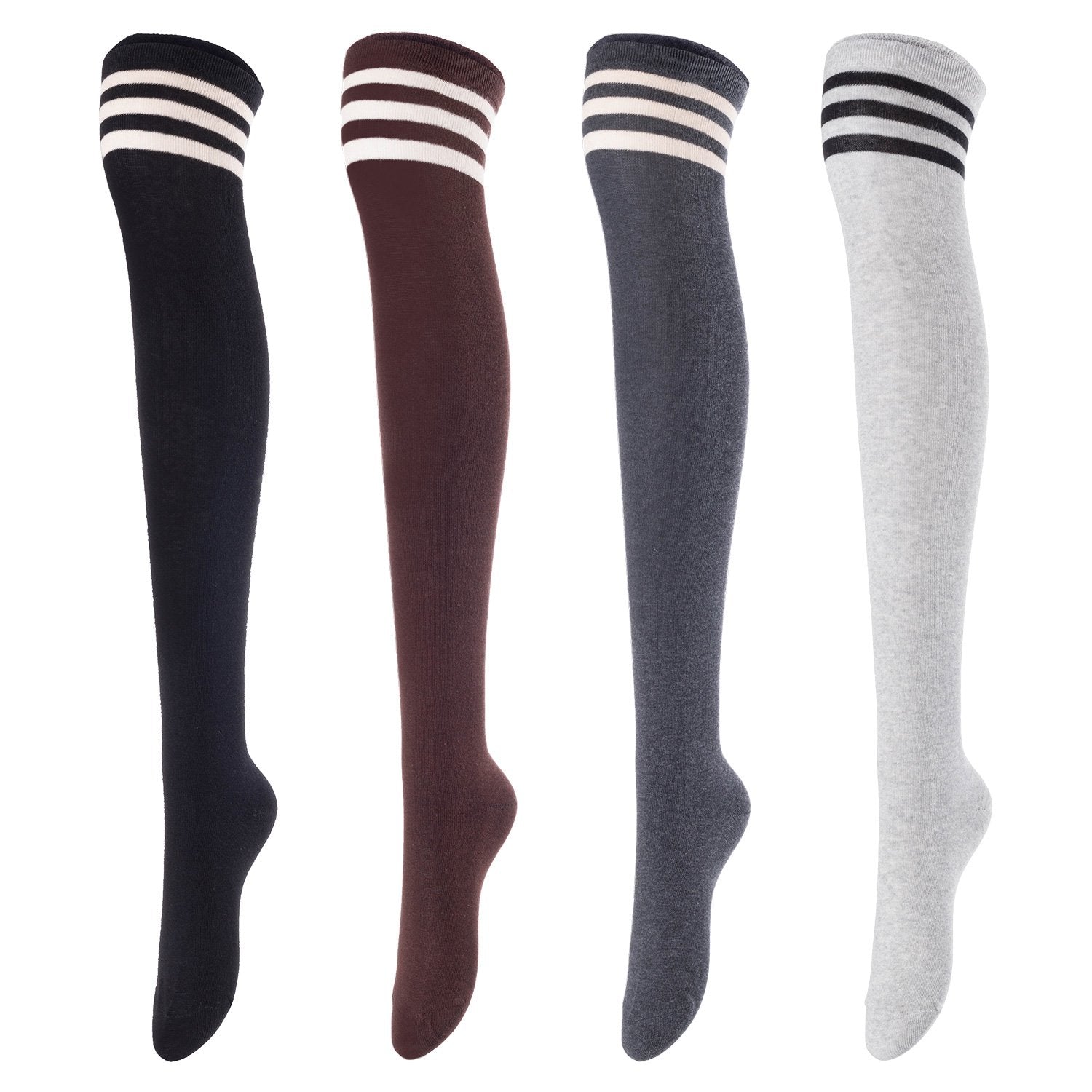 Remarkable Big Girls' Women's 4 Pairs Thigh High Cotton Socks, Long Lasting, Colorful and Fancy LBG1022 One Size (Black, Coffee, Dark Grey, Grey)